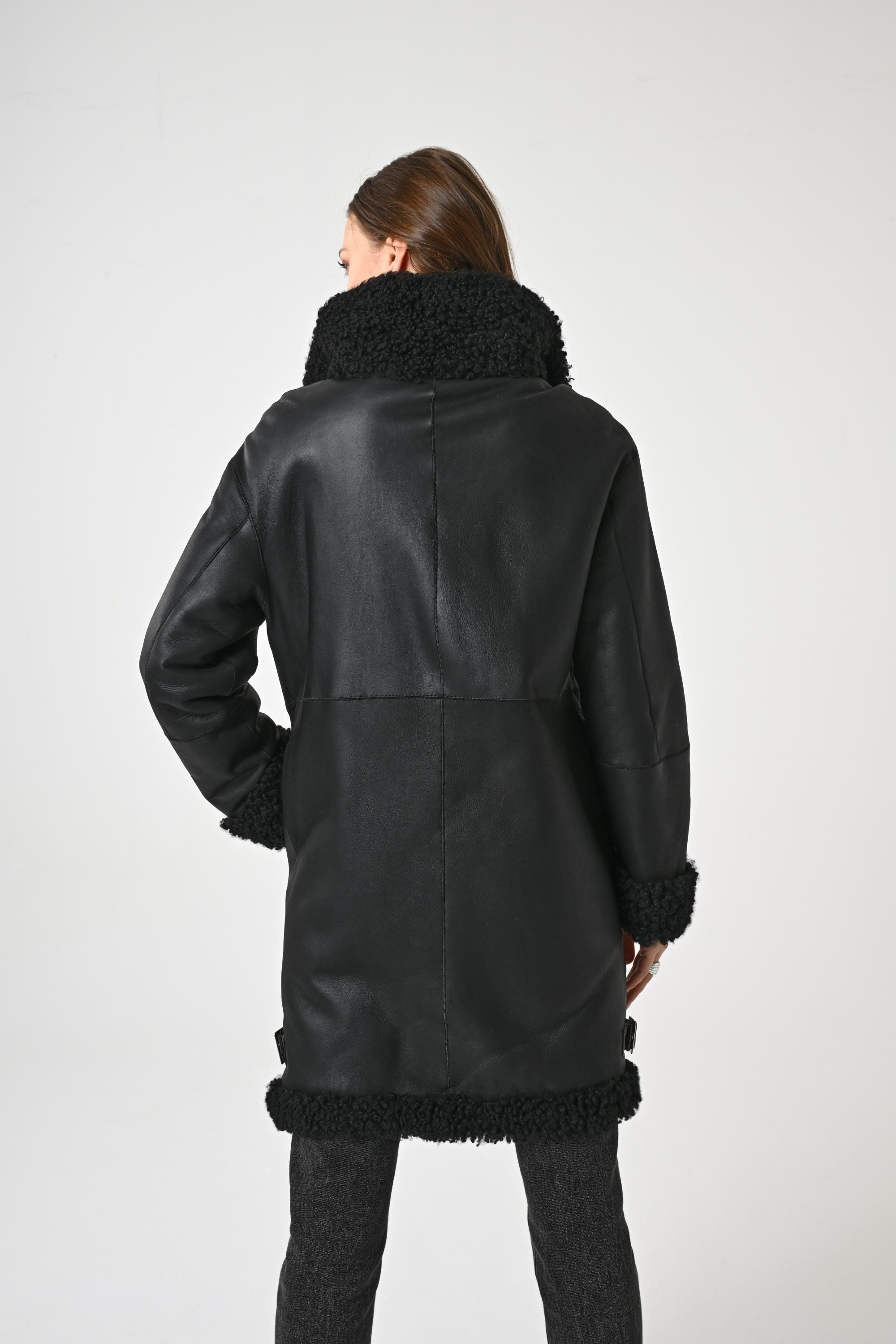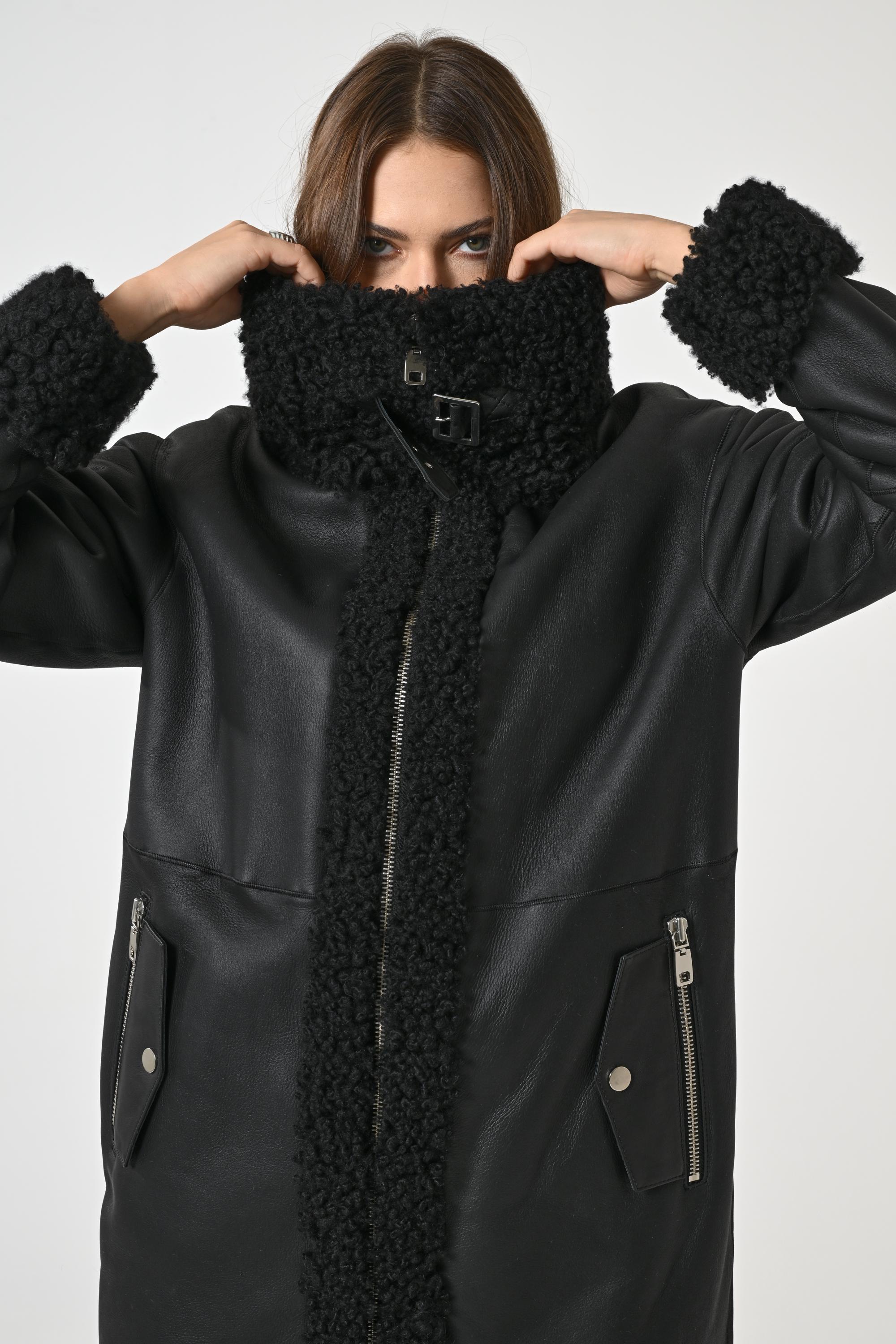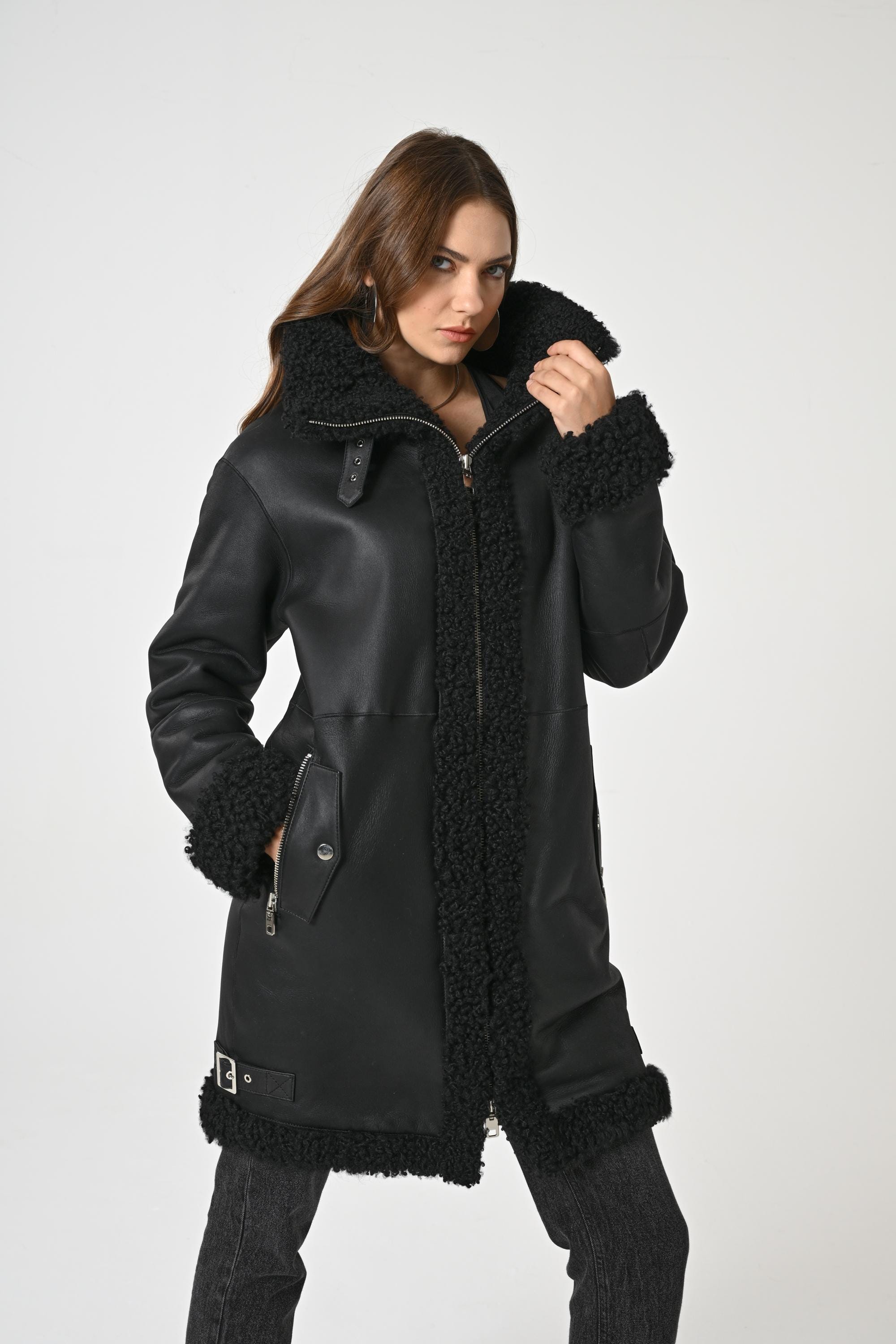 BLACK WOMAN JACKET | Woman Black Genuine Leather Jacket | Curly Merino Fur Trimmed Ziper Coat | Woman Fall Coat | Winter Woman Coat |