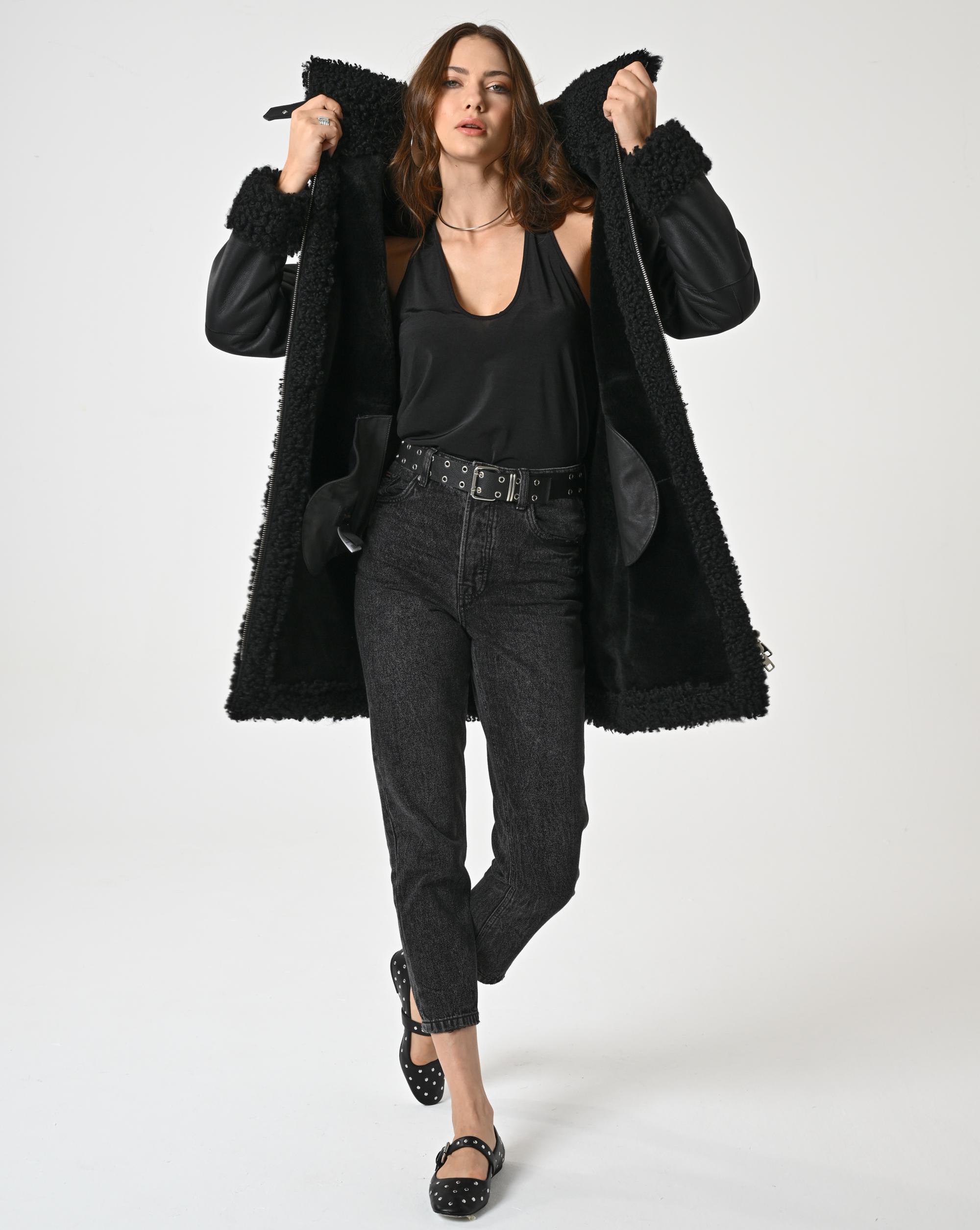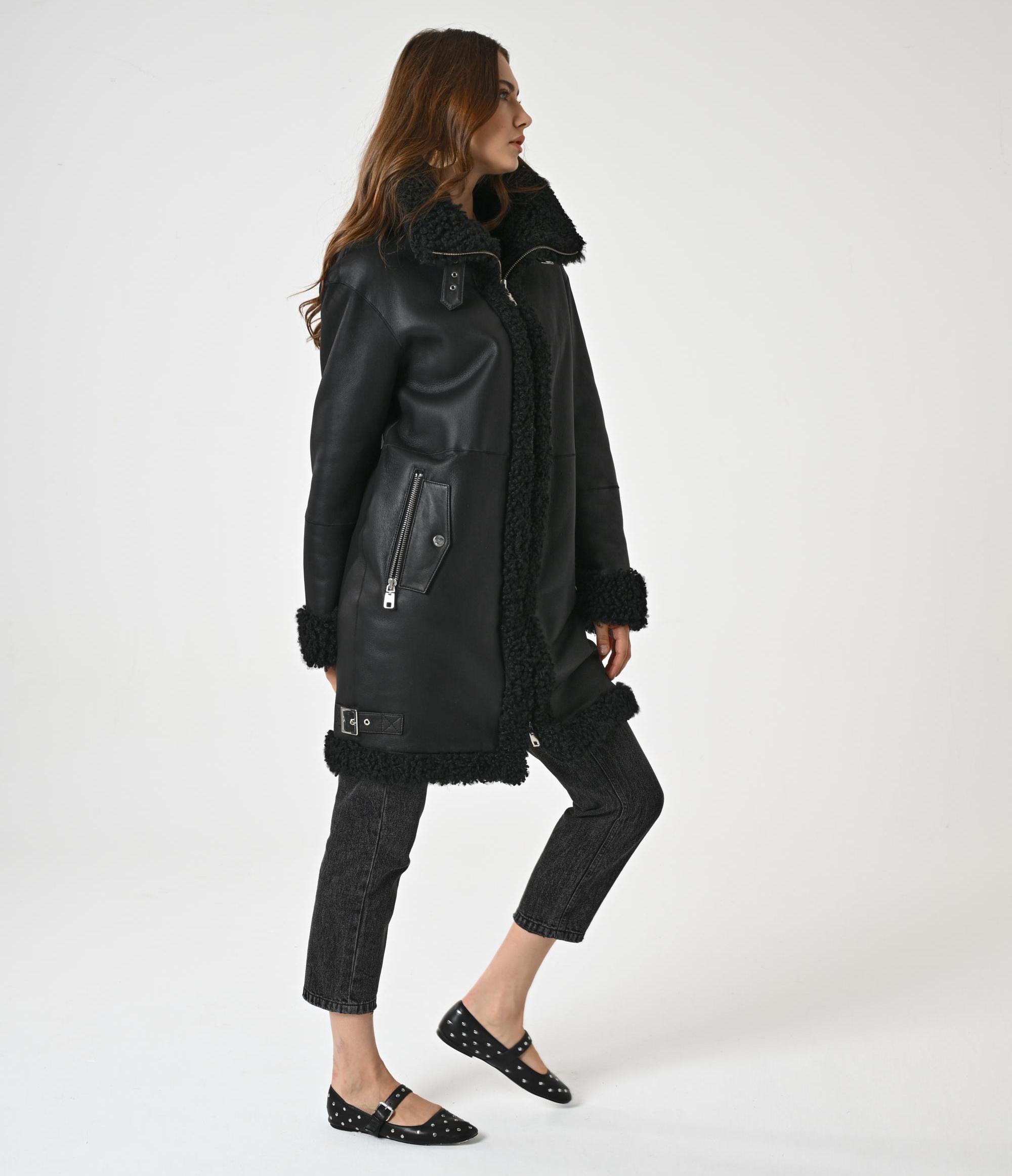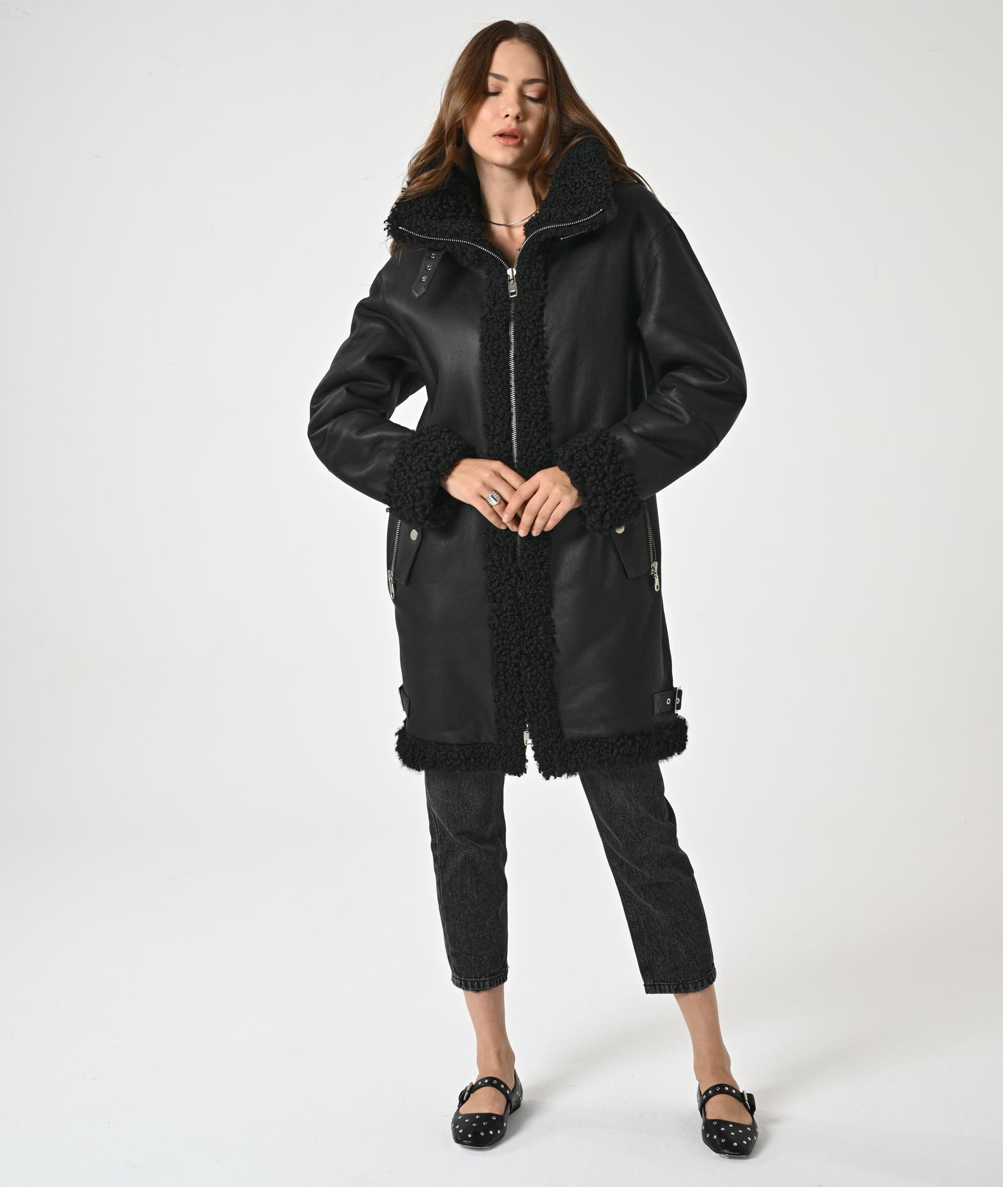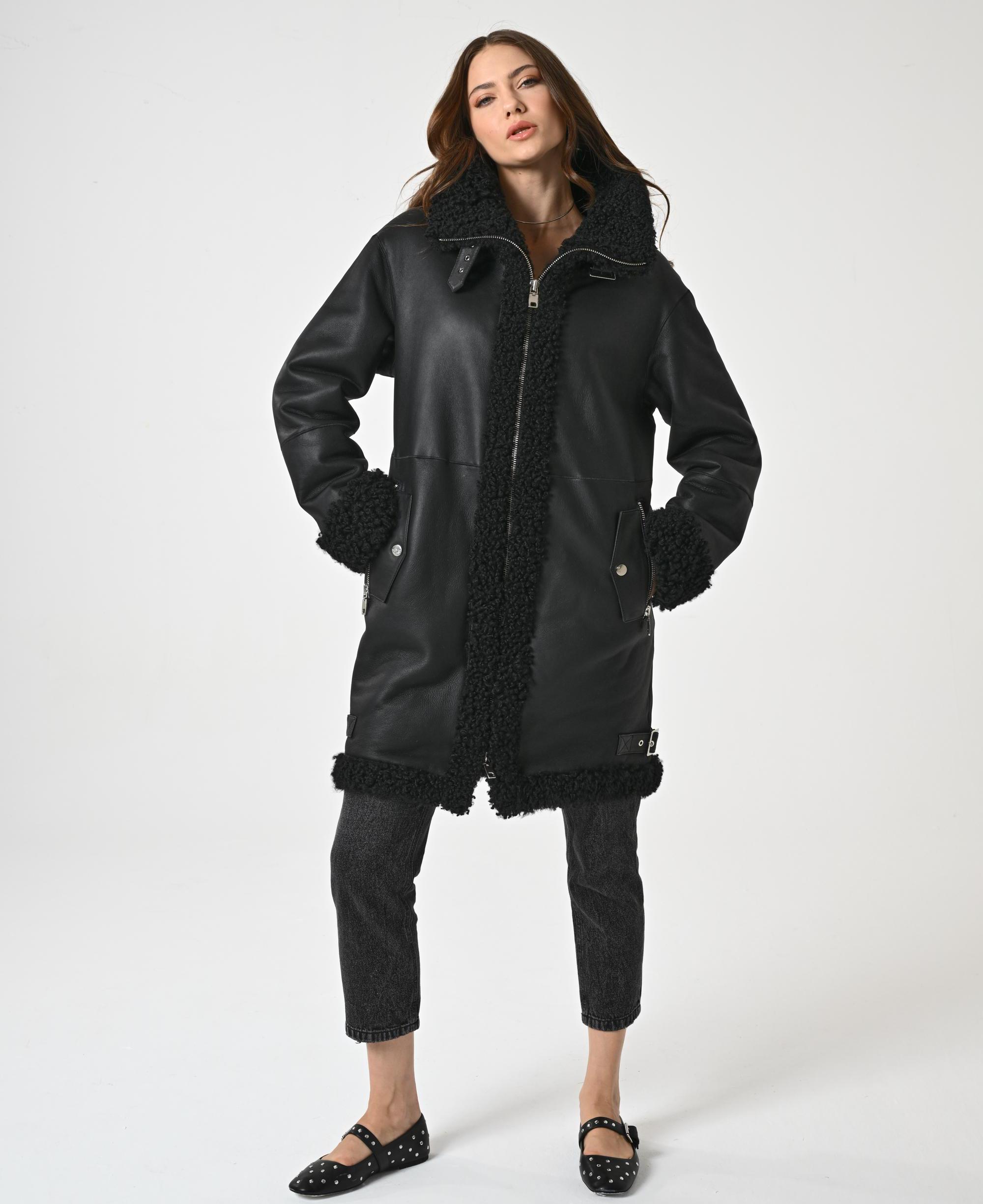 BLACK WOMAN JACKET | Woman Black Genuine Leather Jacket | Curly Merino Fur Trimmed Ziper Coat | Woman Fall Coat | Winter Woman Coat |