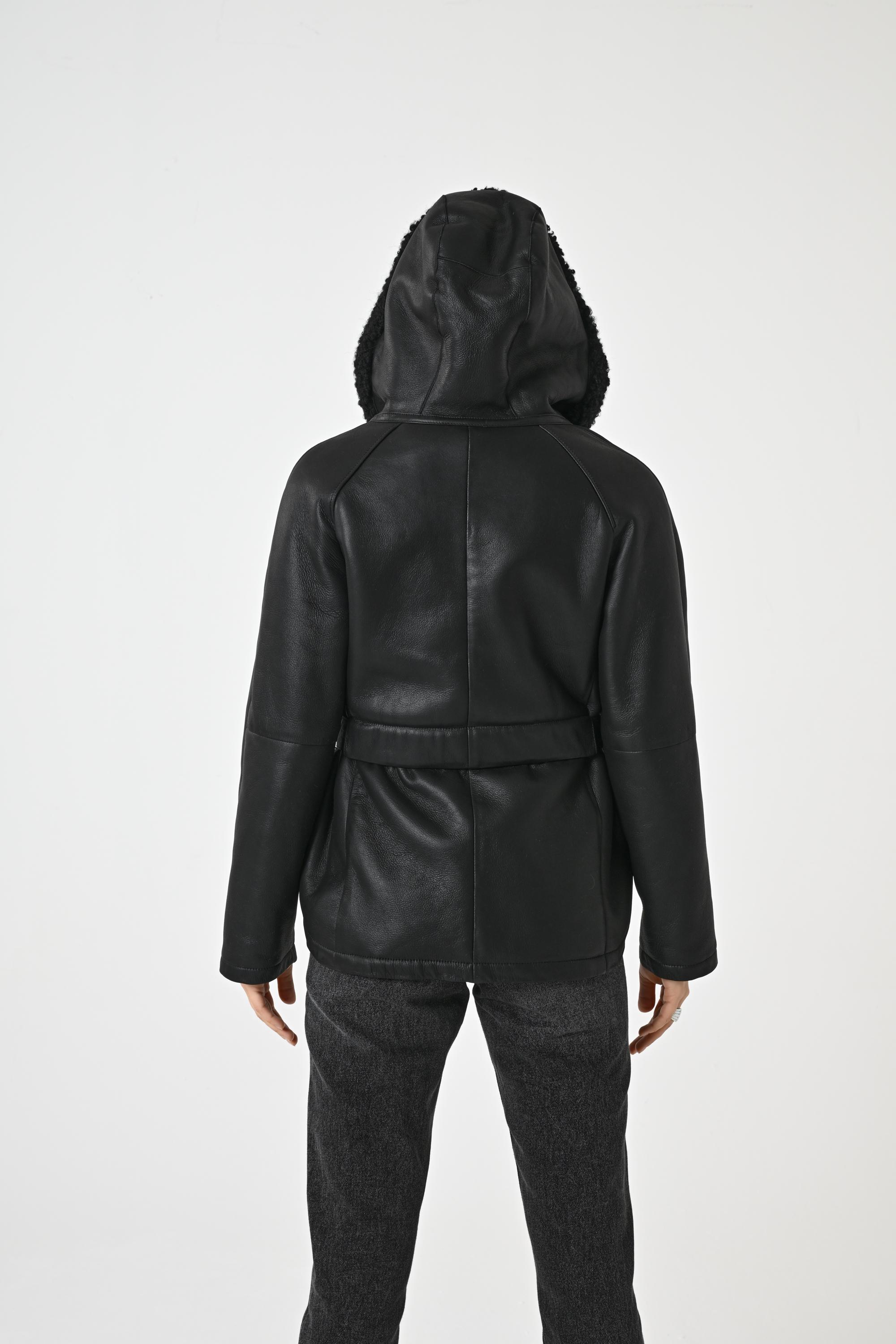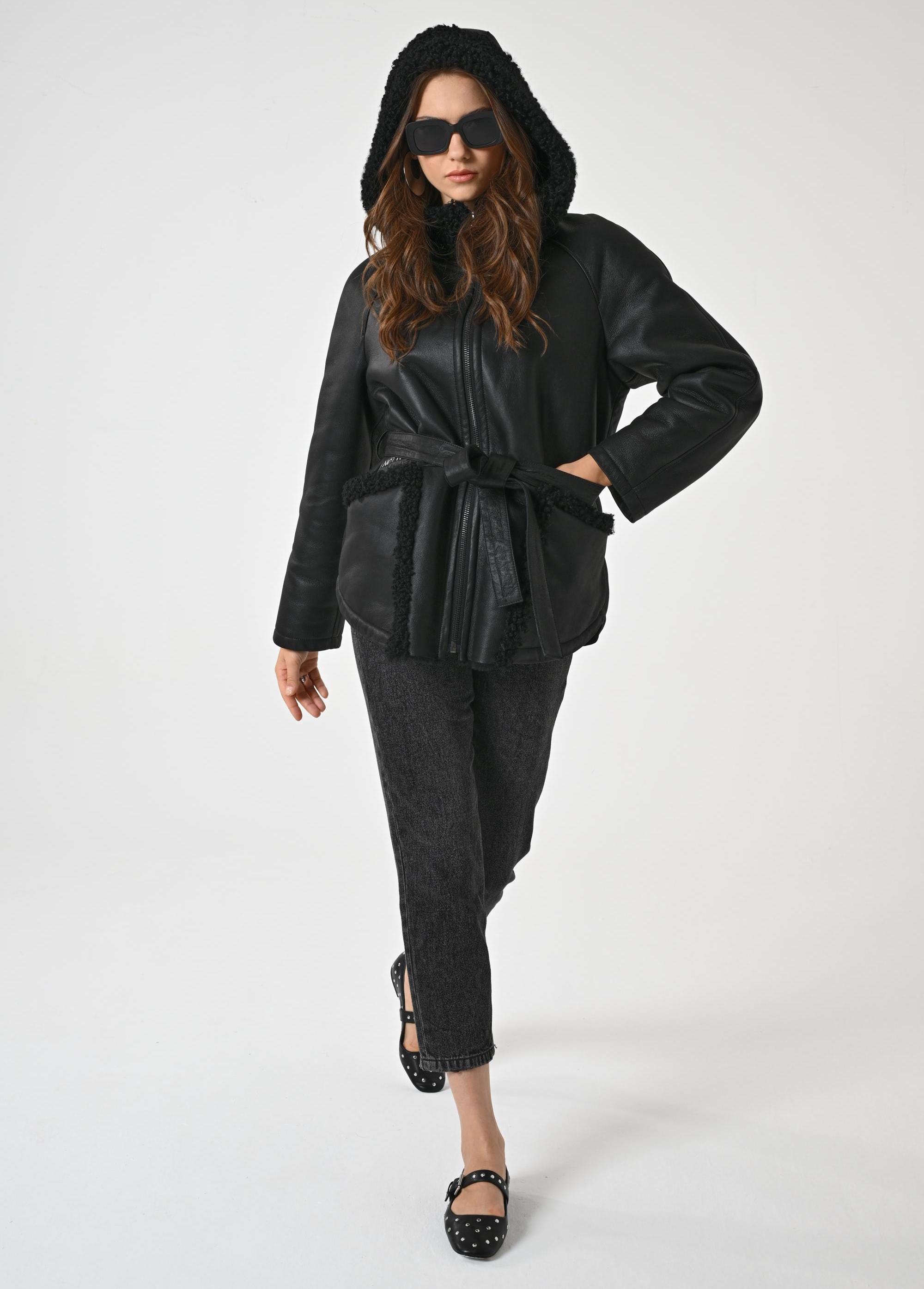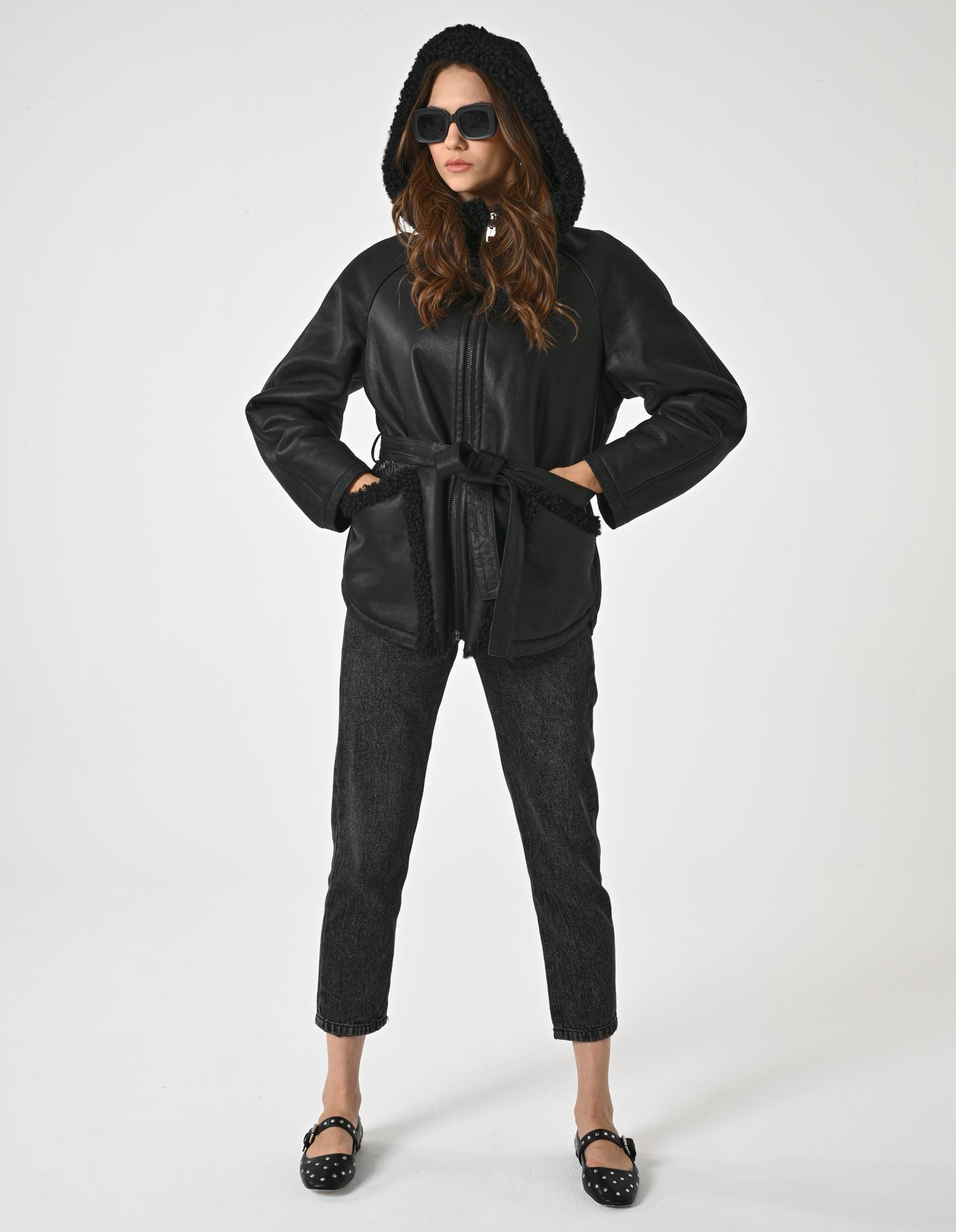 BLACK WOMAN JACKET | Hooded Black Woman Jacket | Genuine Spanish Merino Lambskin Jacket | Curly Merino Trimmed Jacket | Jackets for Woman |