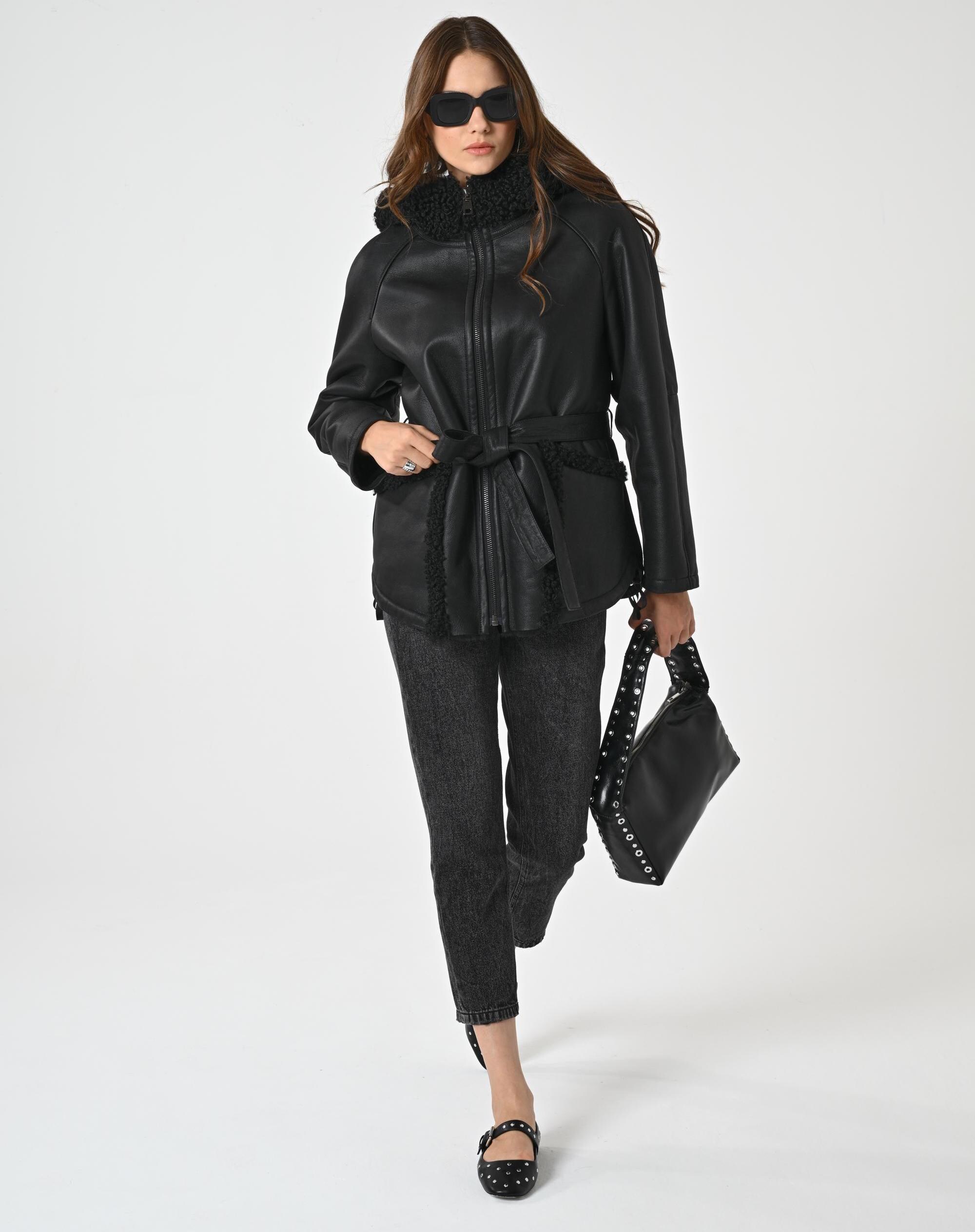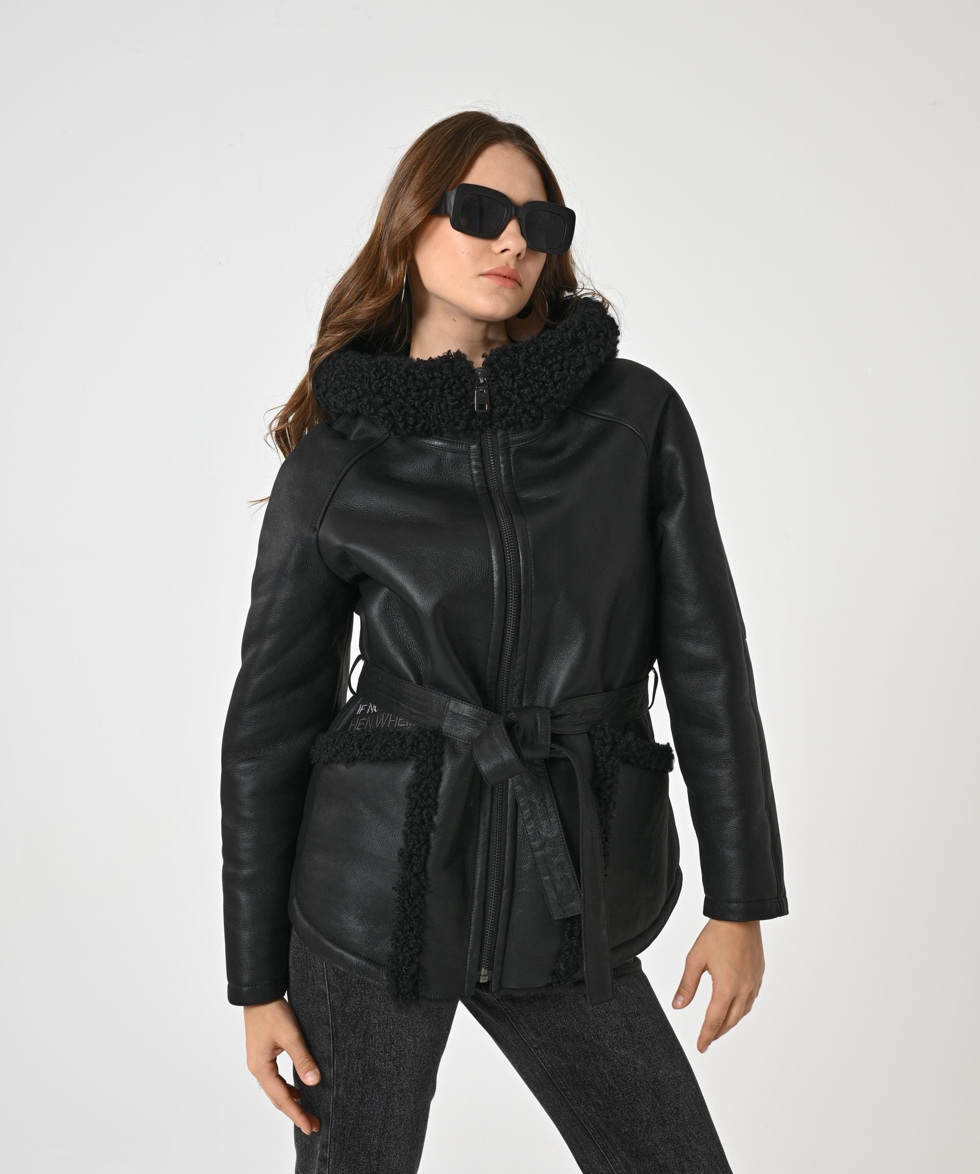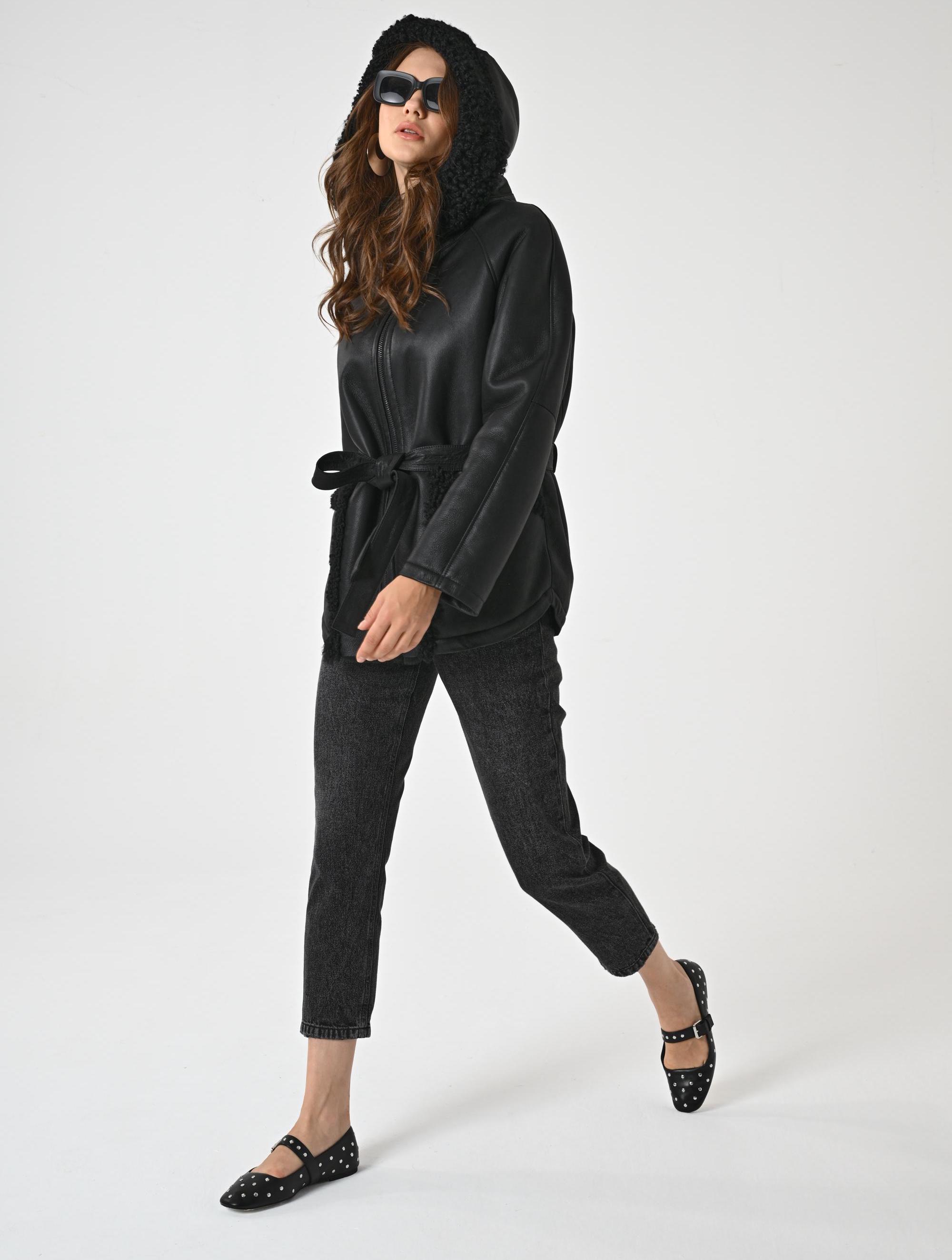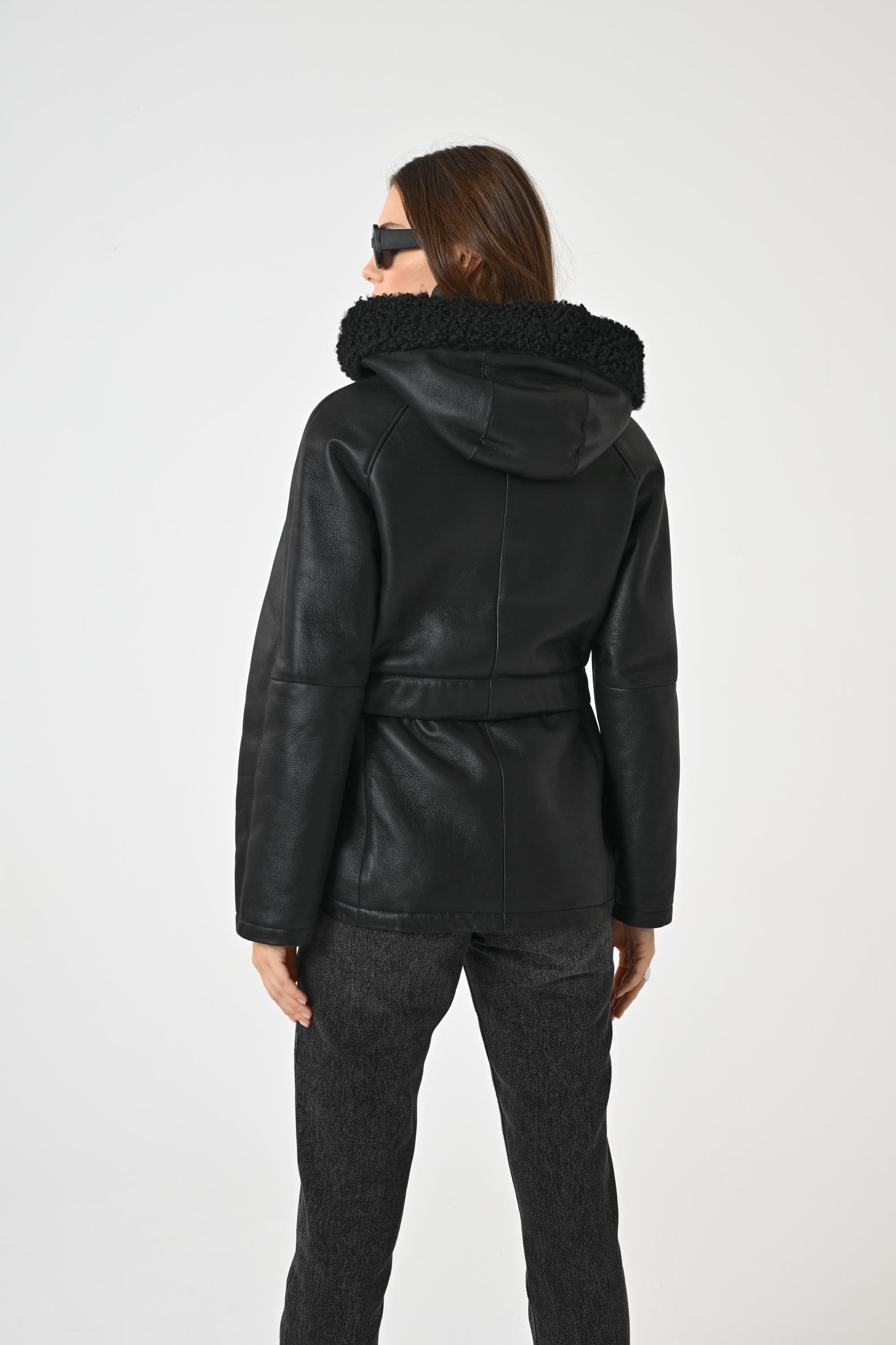 BLACK WOMAN JACKET | Hooded Black Woman Jacket | Genuine Spanish Merino Lambskin Jacket | Curly Merino Trimmed Jacket | Jackets for Woman |