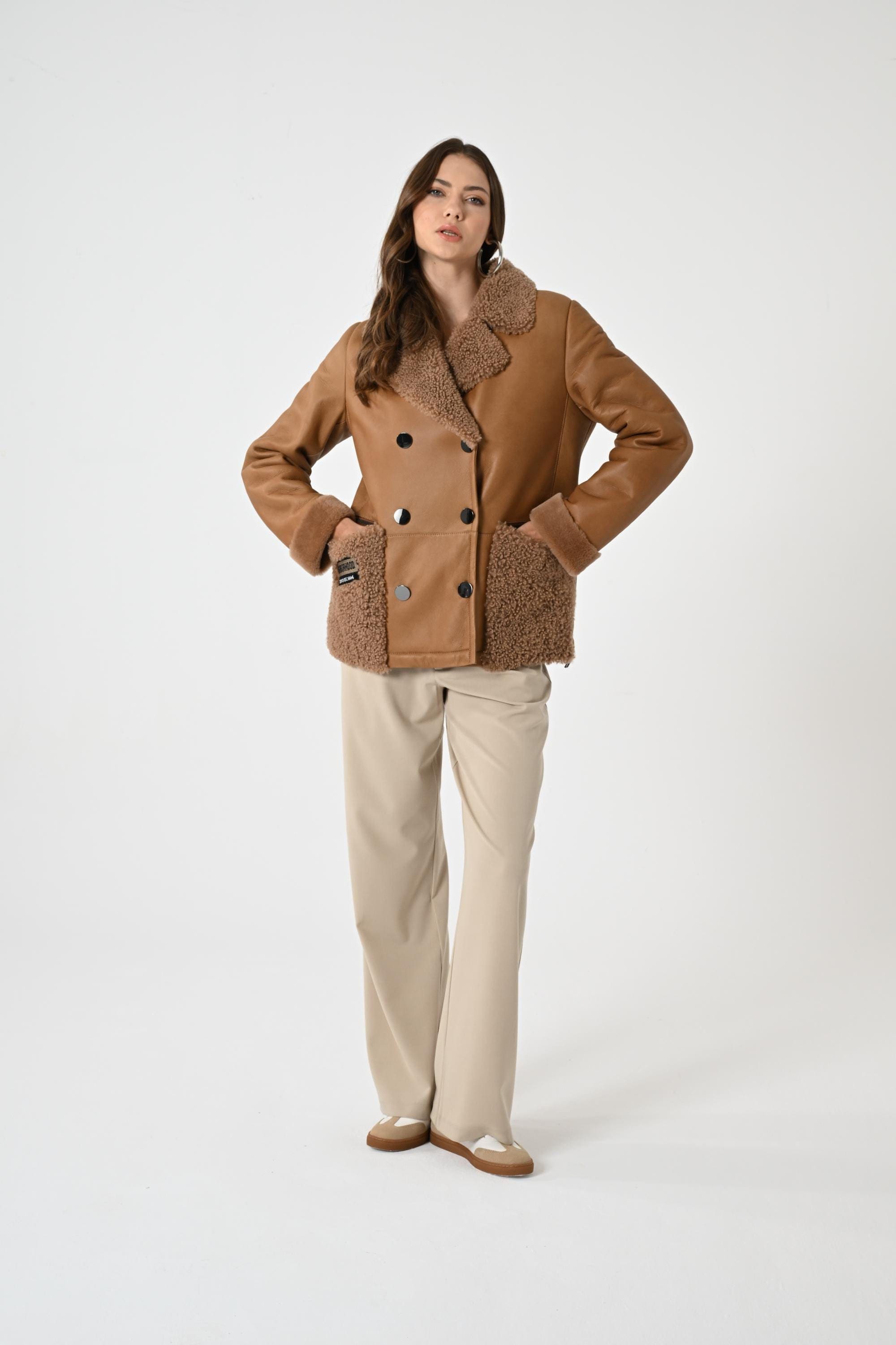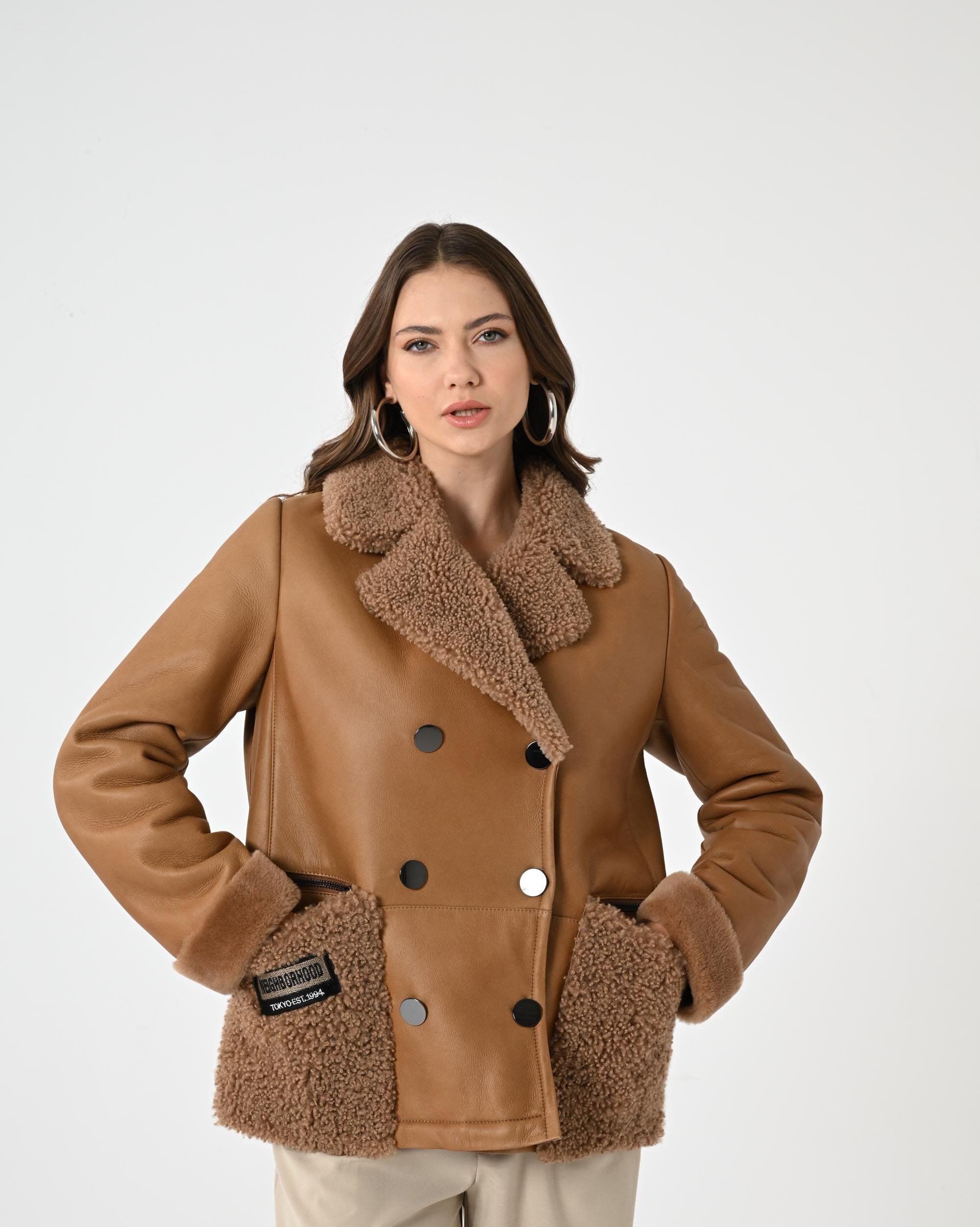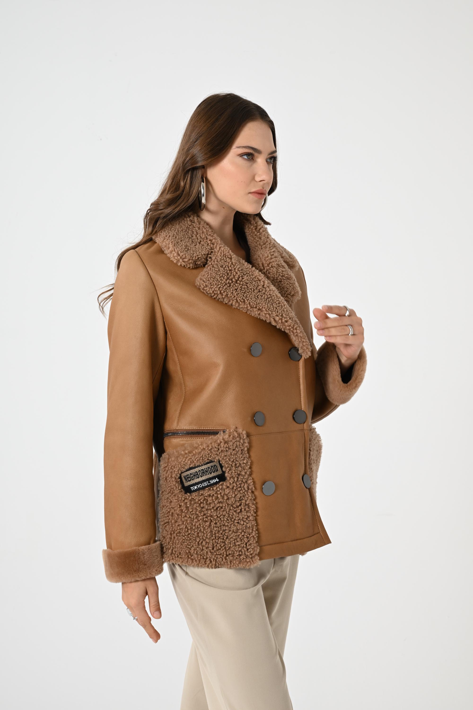 COGNAC BROWN JACKET | Coat for Woman | Genuine Leather Coat | Woman Peacoat | Double-Breasted Coat | Shearling Spanish Merino Collared Coat