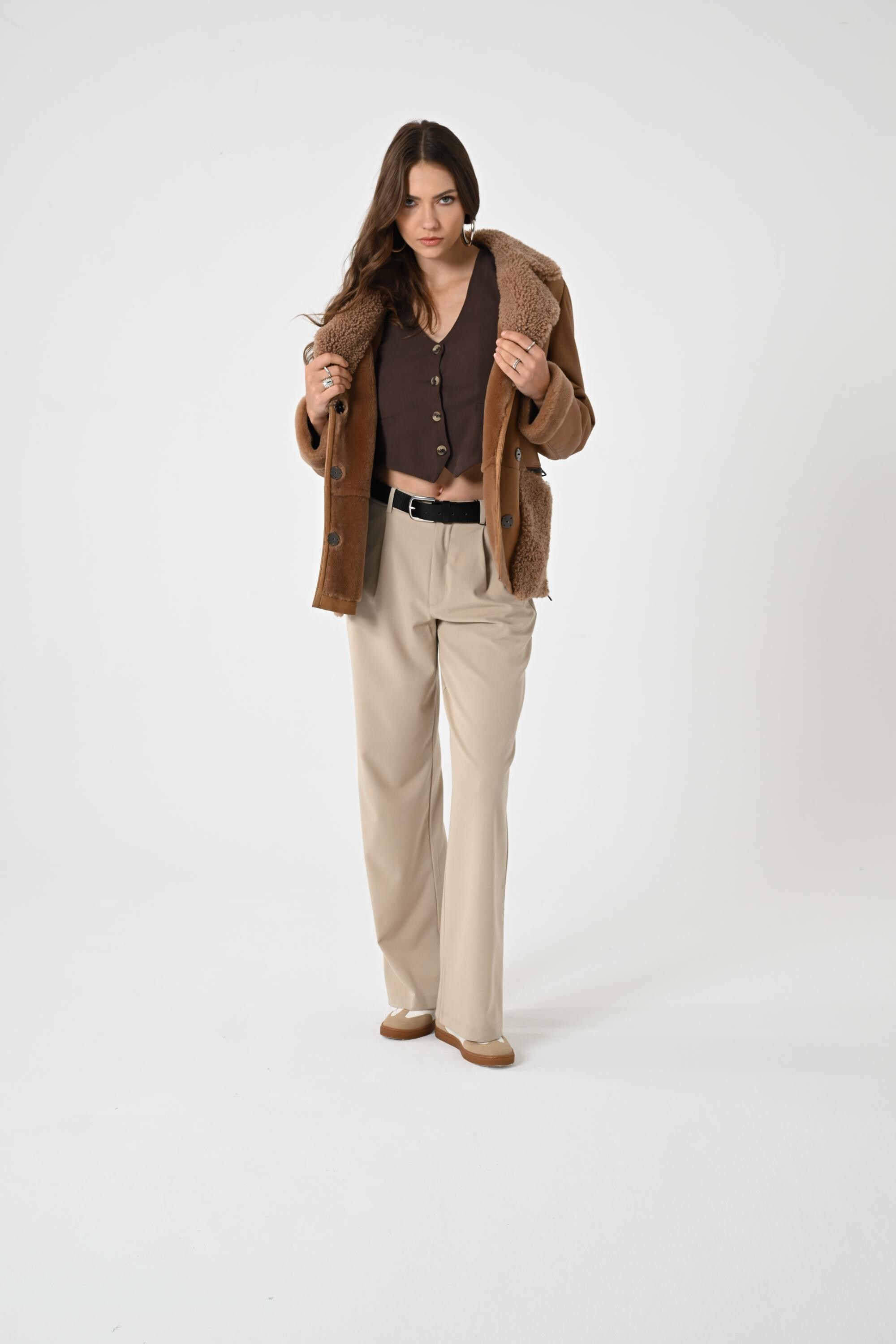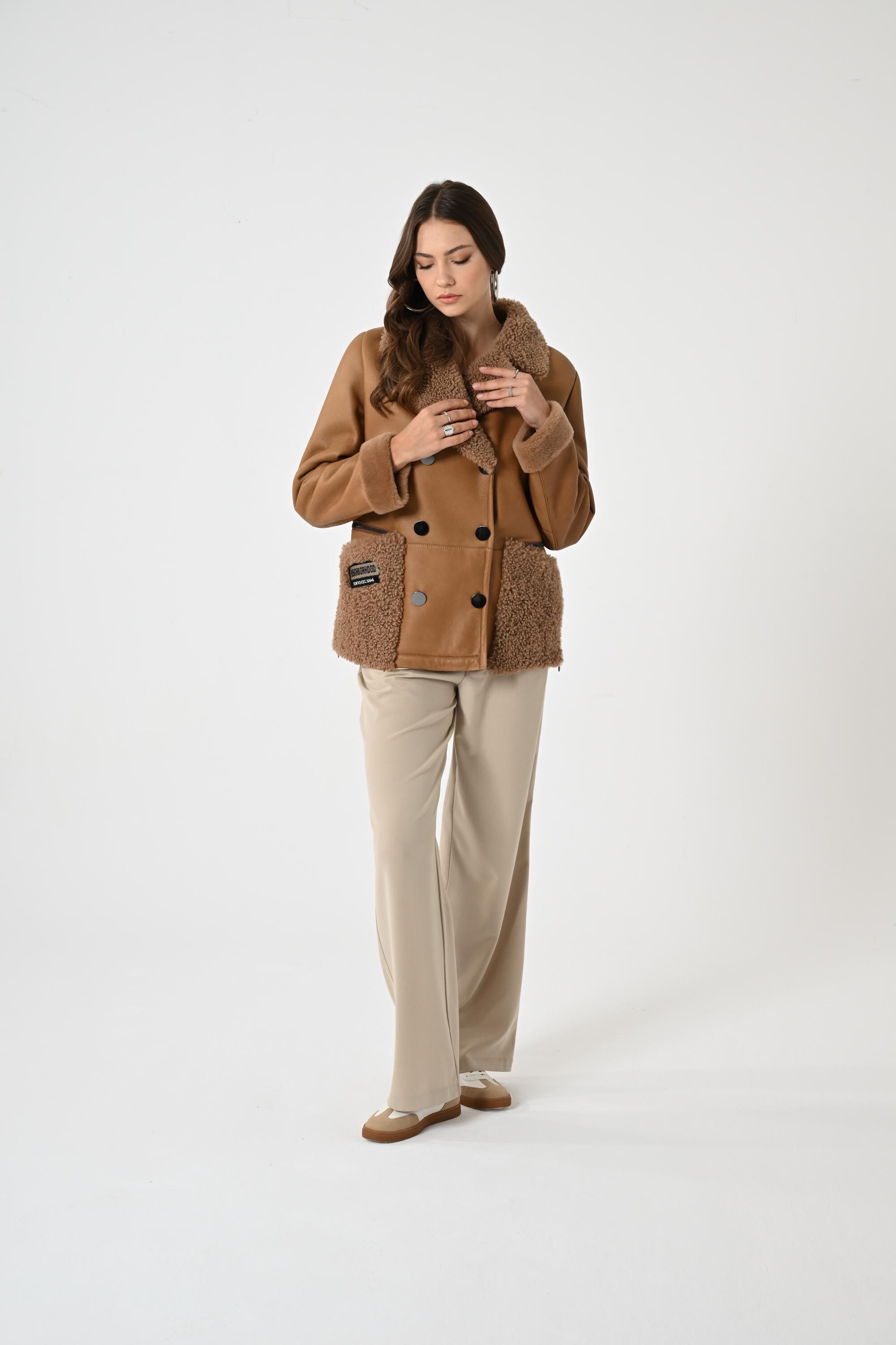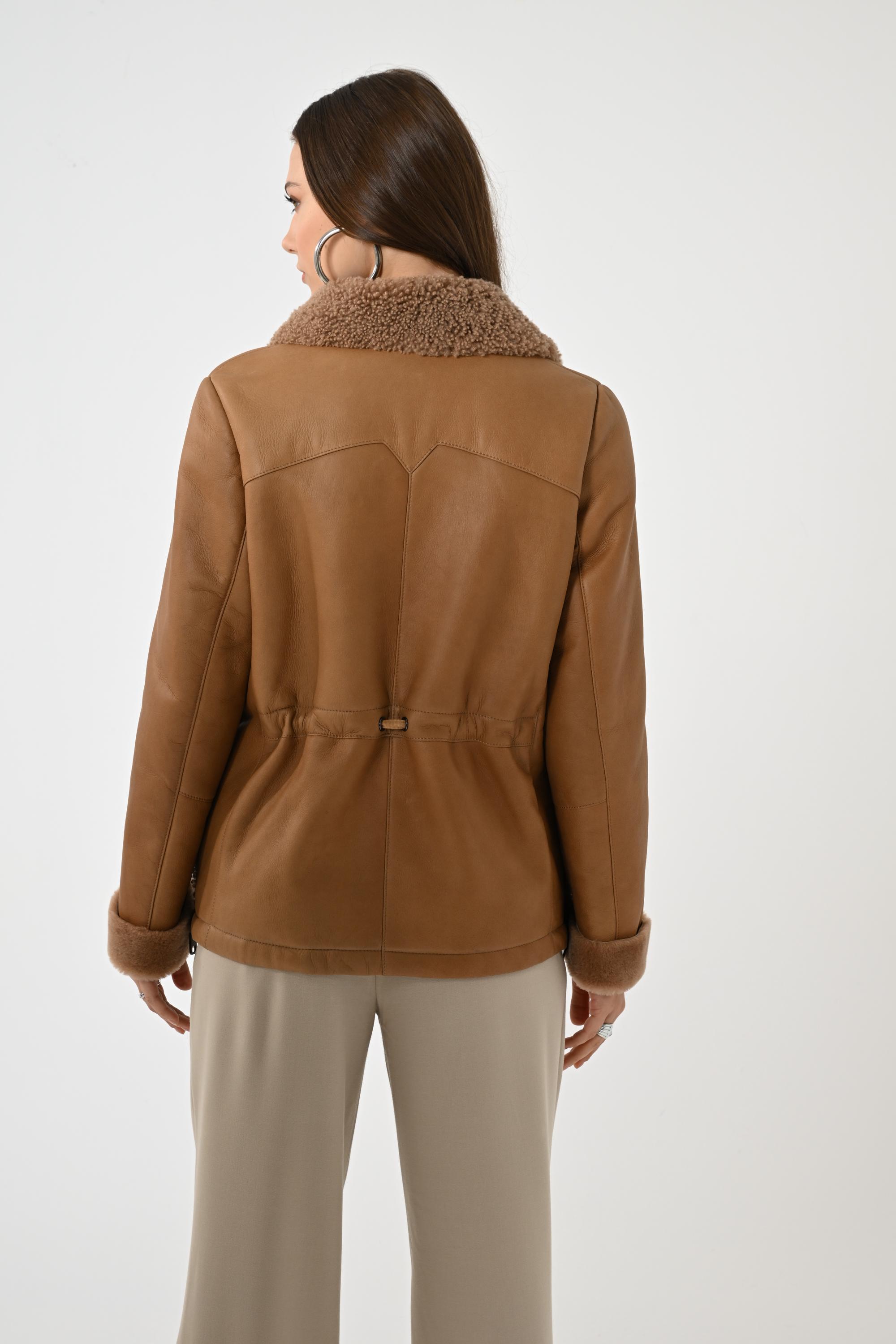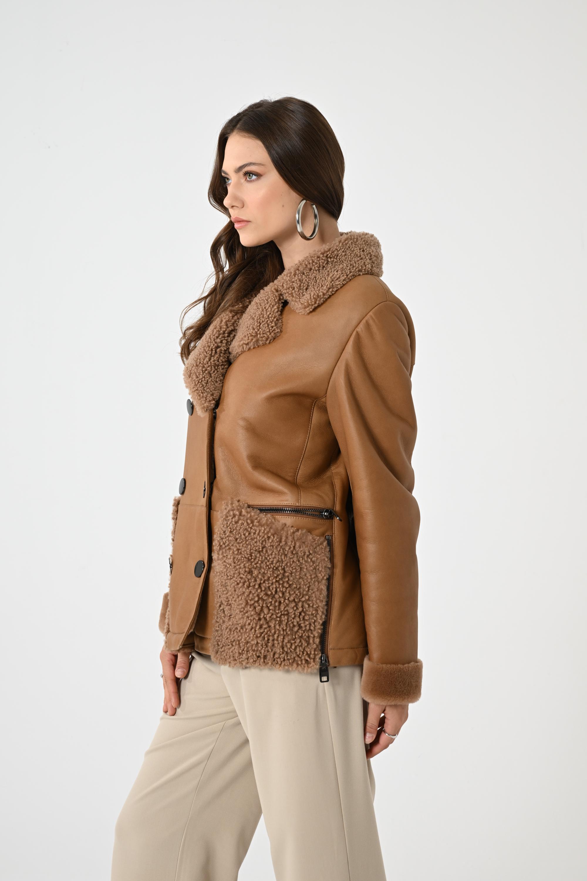 COGNAC BROWN JACKET | Coat for Woman | Genuine Leather Coat | Woman Peacoat | Double-Breasted Coat | Shearling Spanish Merino Collared Coat