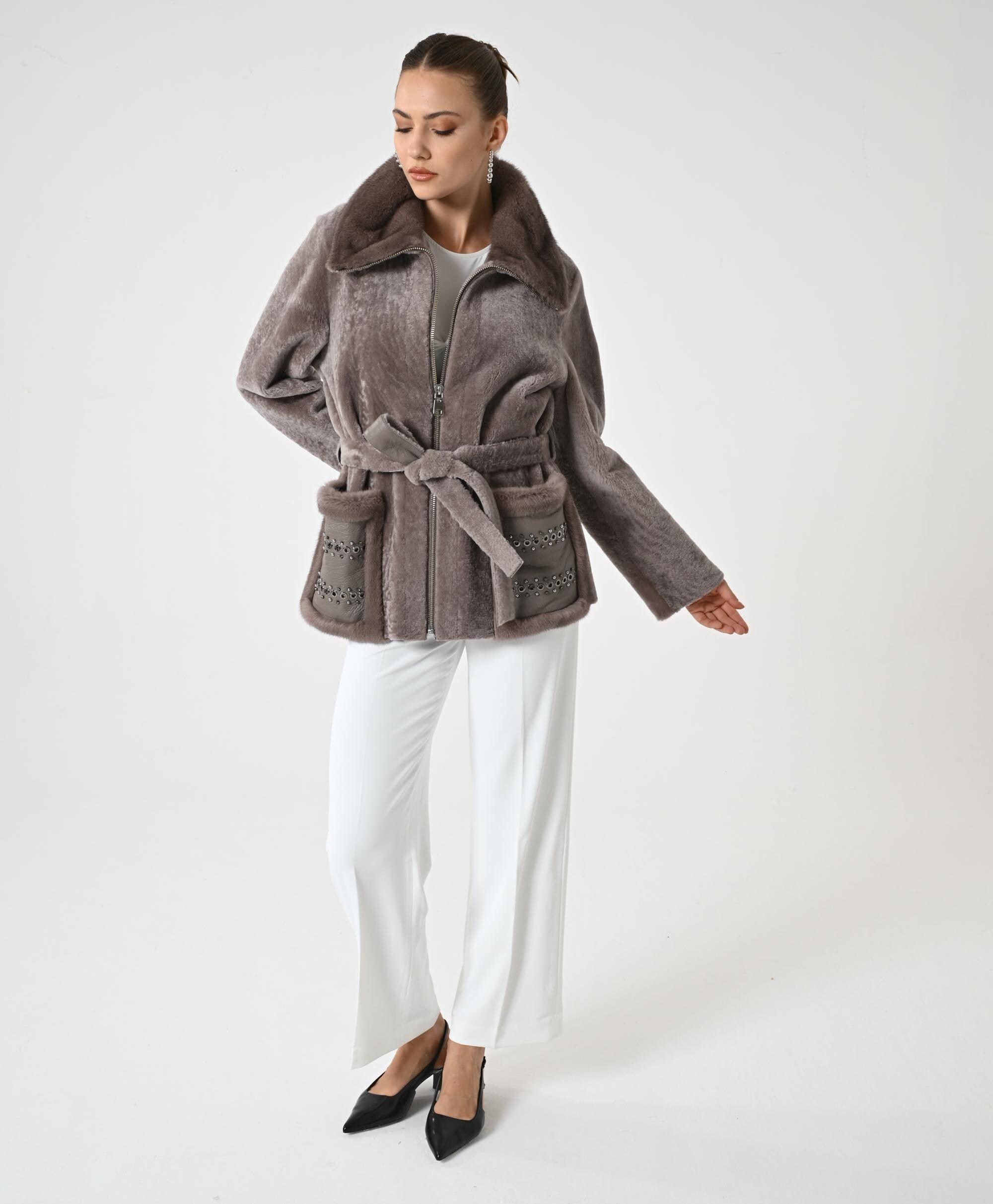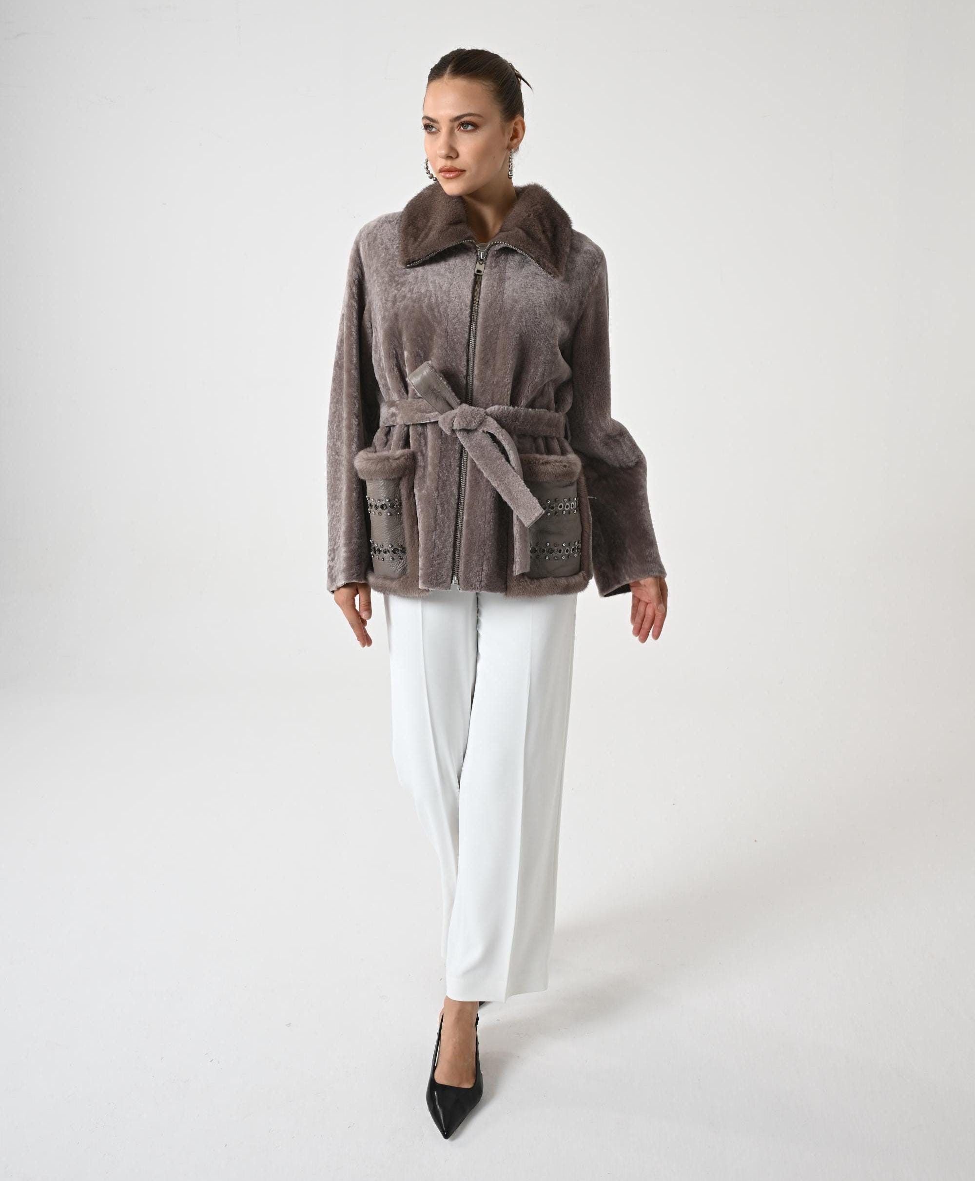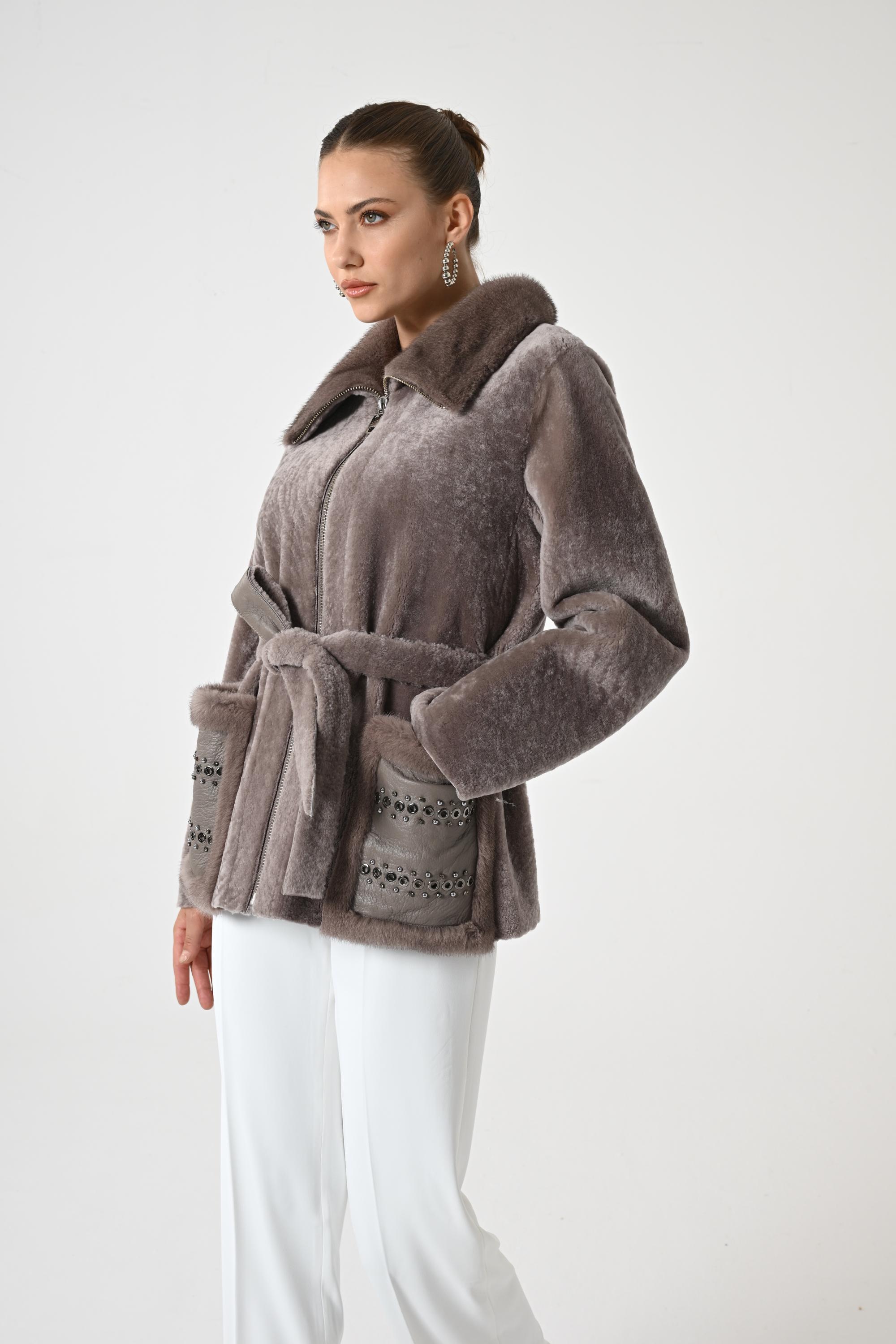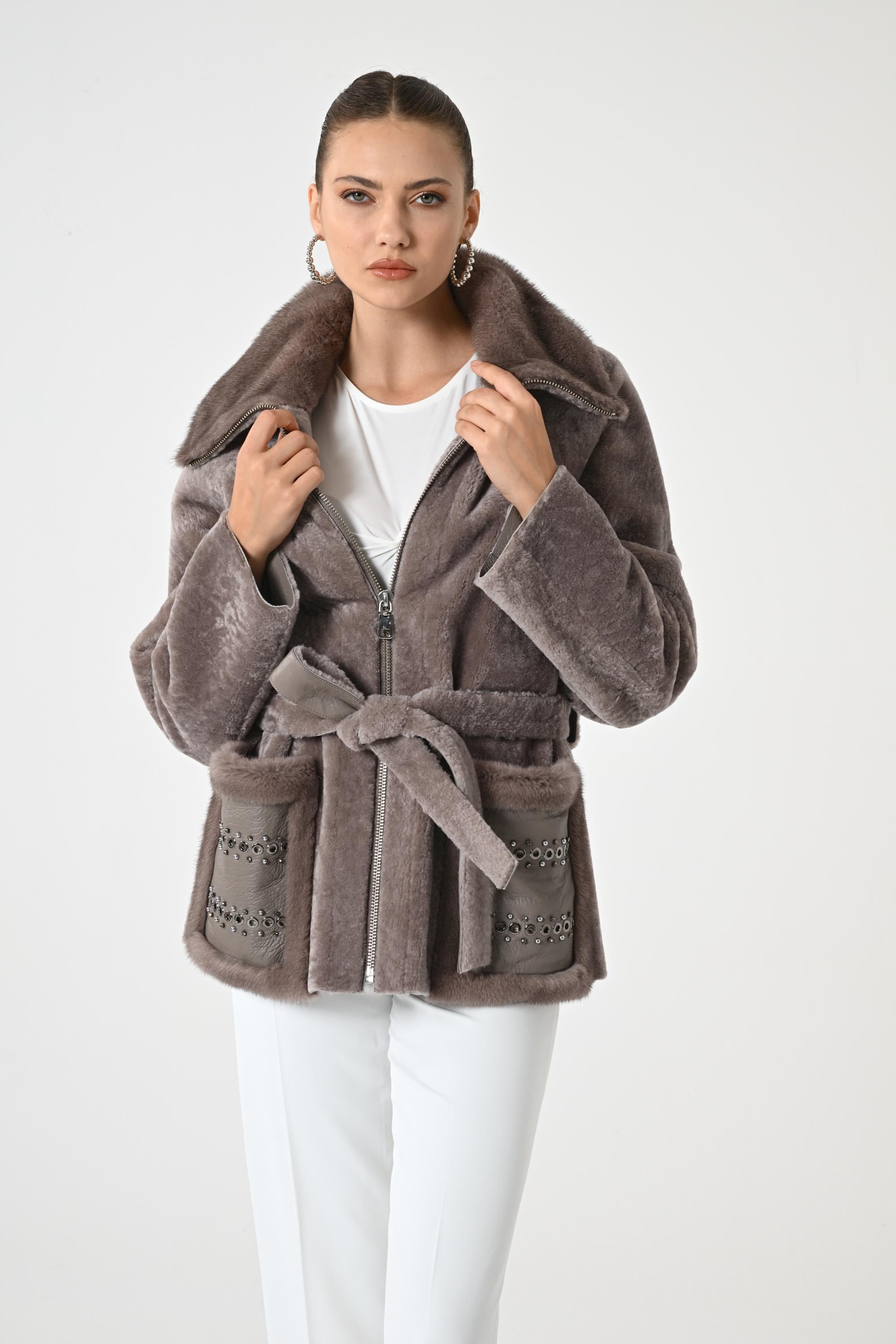 WOMEN COAT | Mink Colour Women Coat | Genuine Mink Fur Trimmed Collared Coat for Women | Winter Coat for Woman | Genuine Astrakhan Lambskin