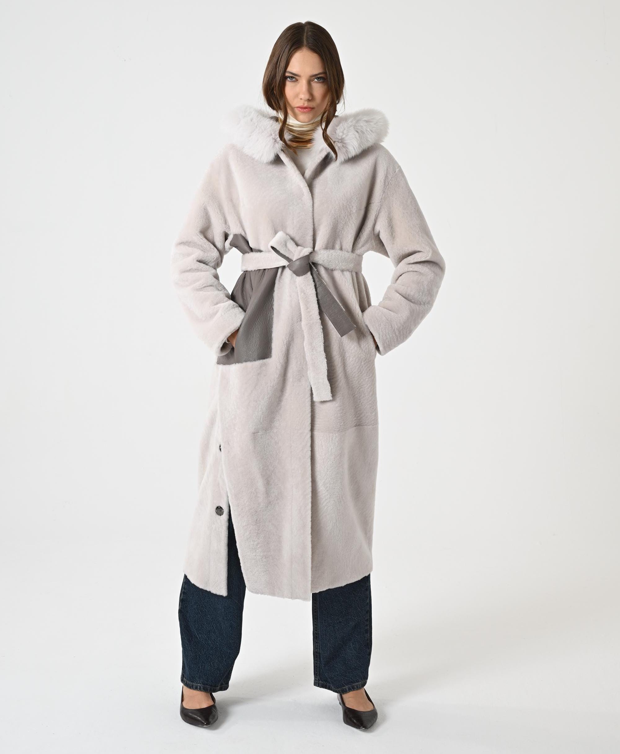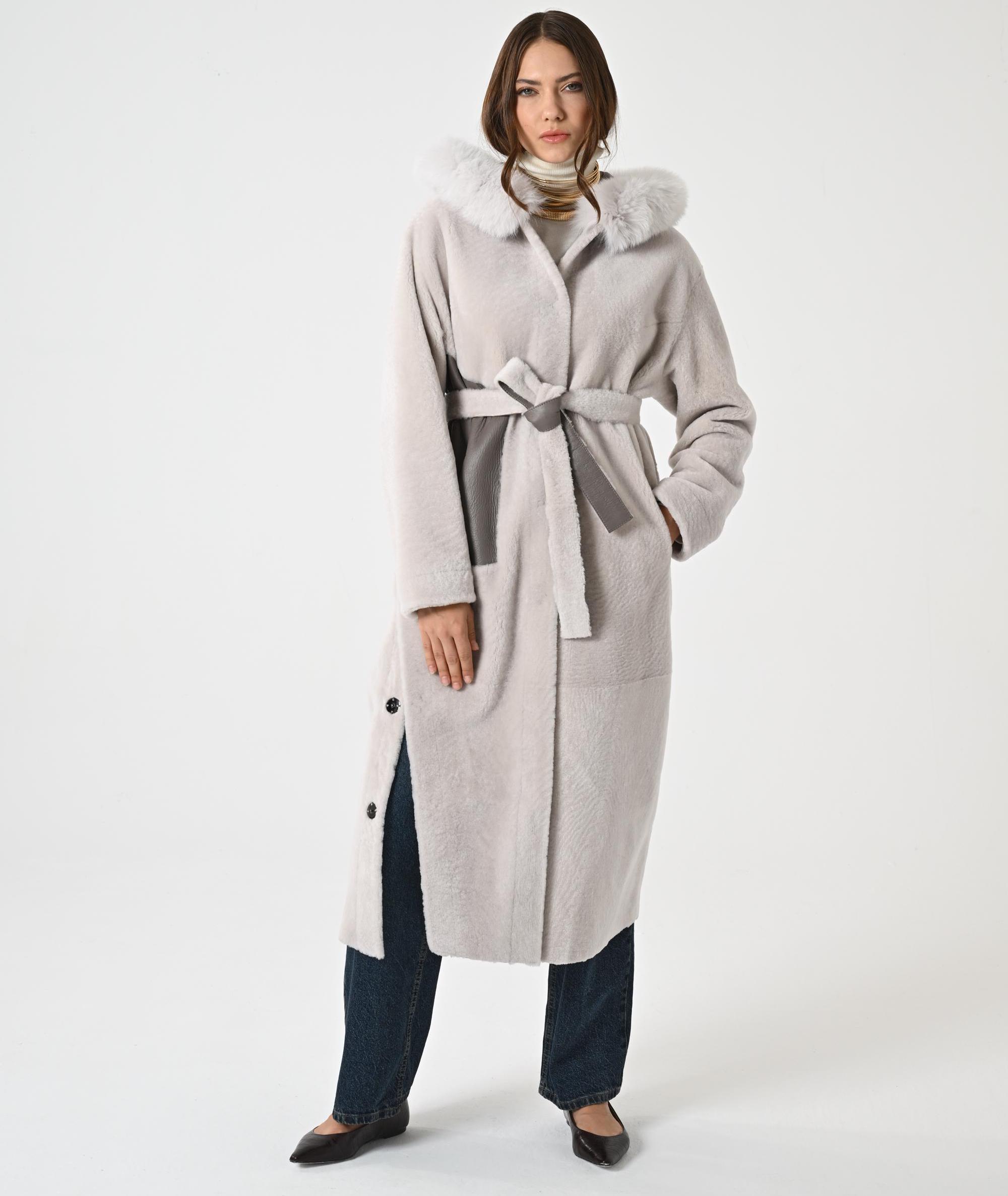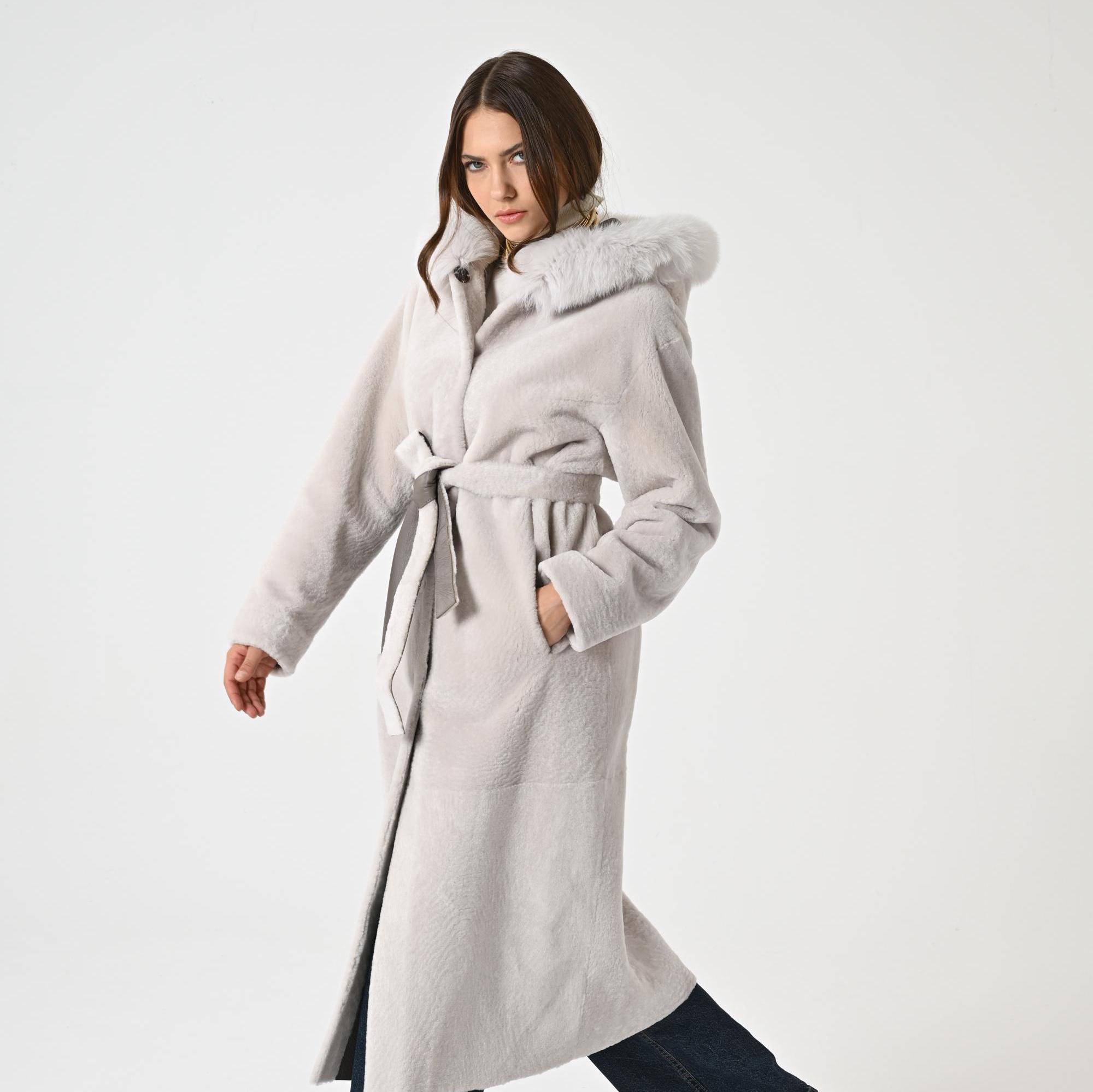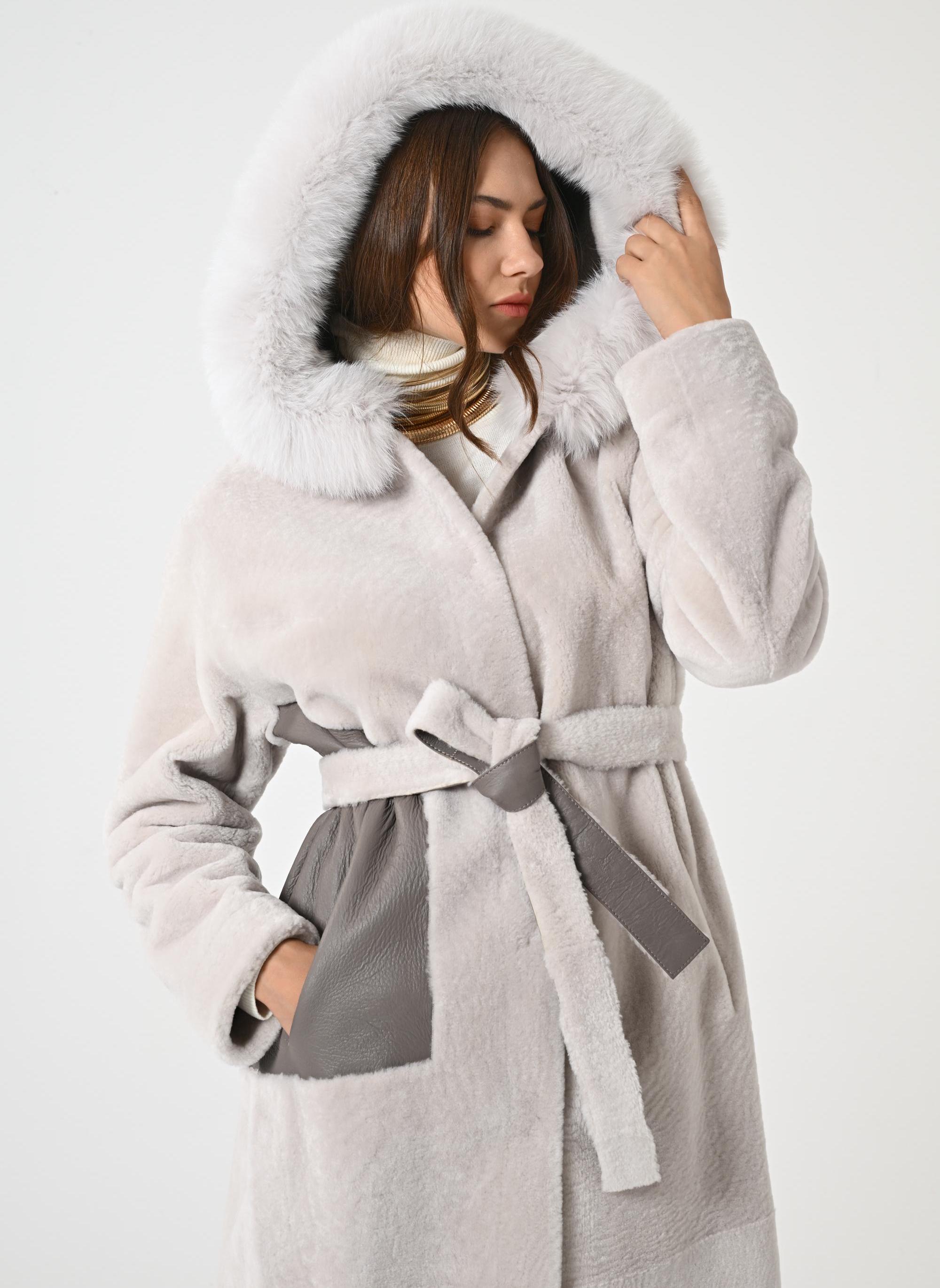 SHEEPSKIN ASTRAKHAN OVERCOAT | Coat for Woman | Beige Genuine Letaher Woman Astrakhan Overcoat | Genuine Fox Trimmed Hooded Overcoat |