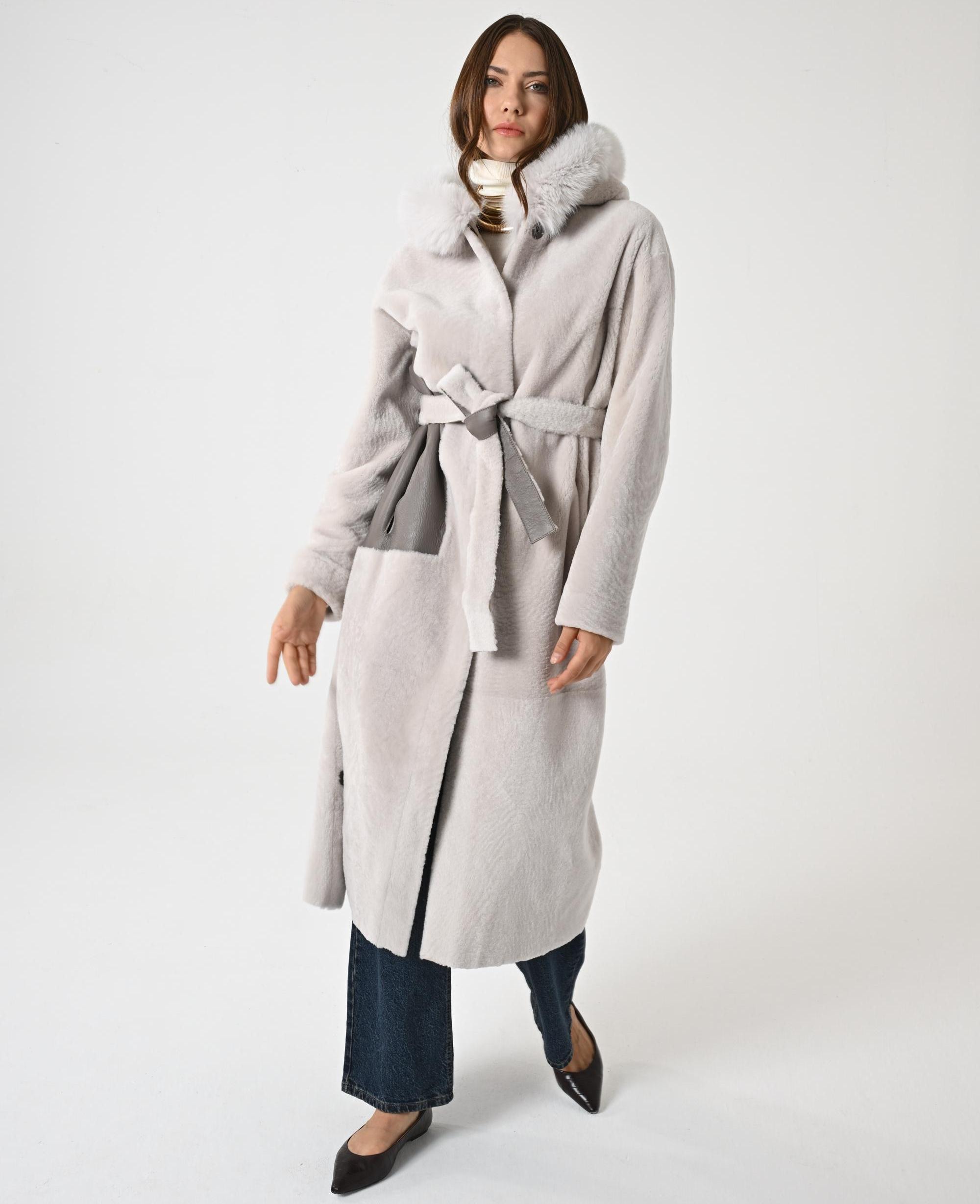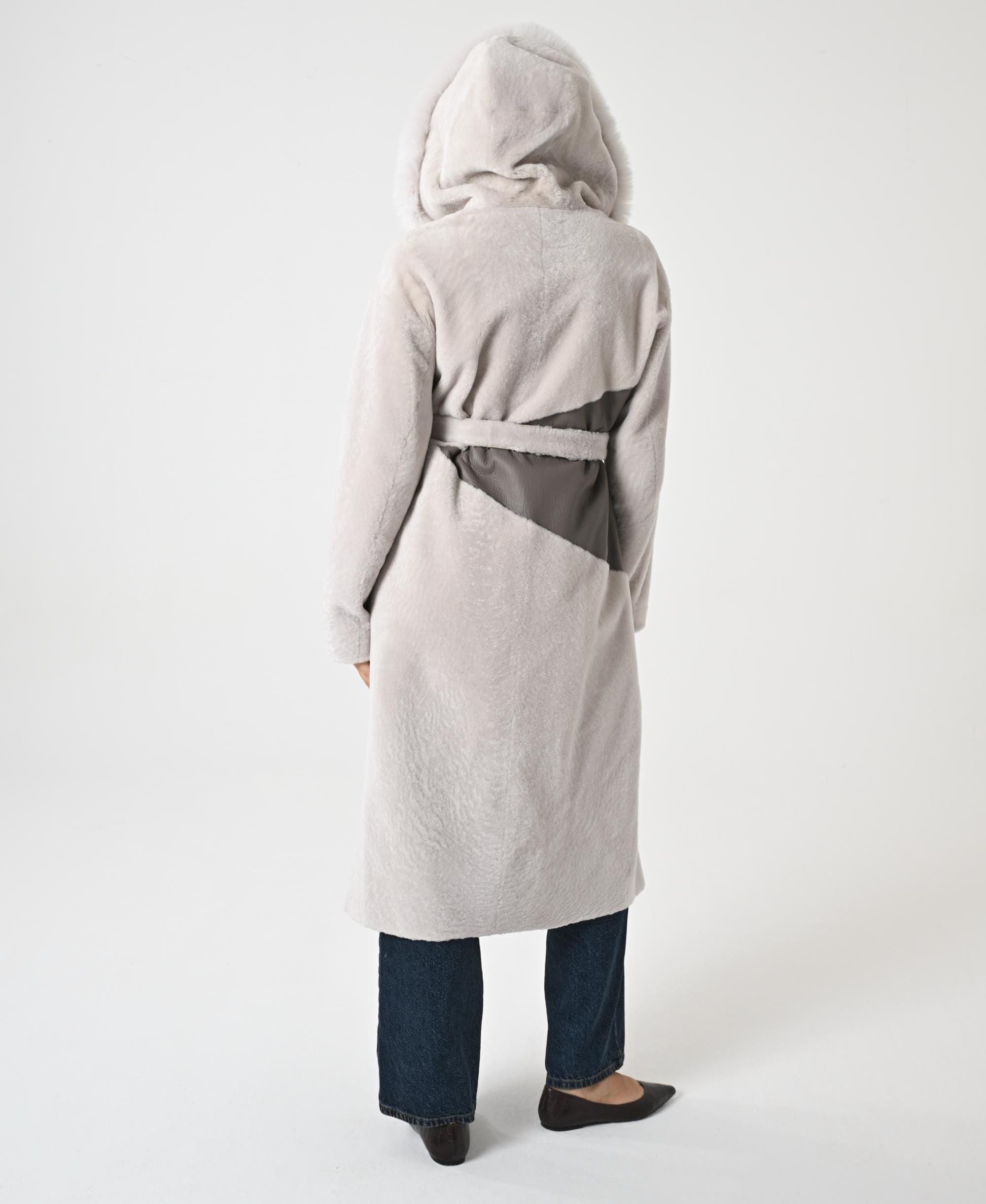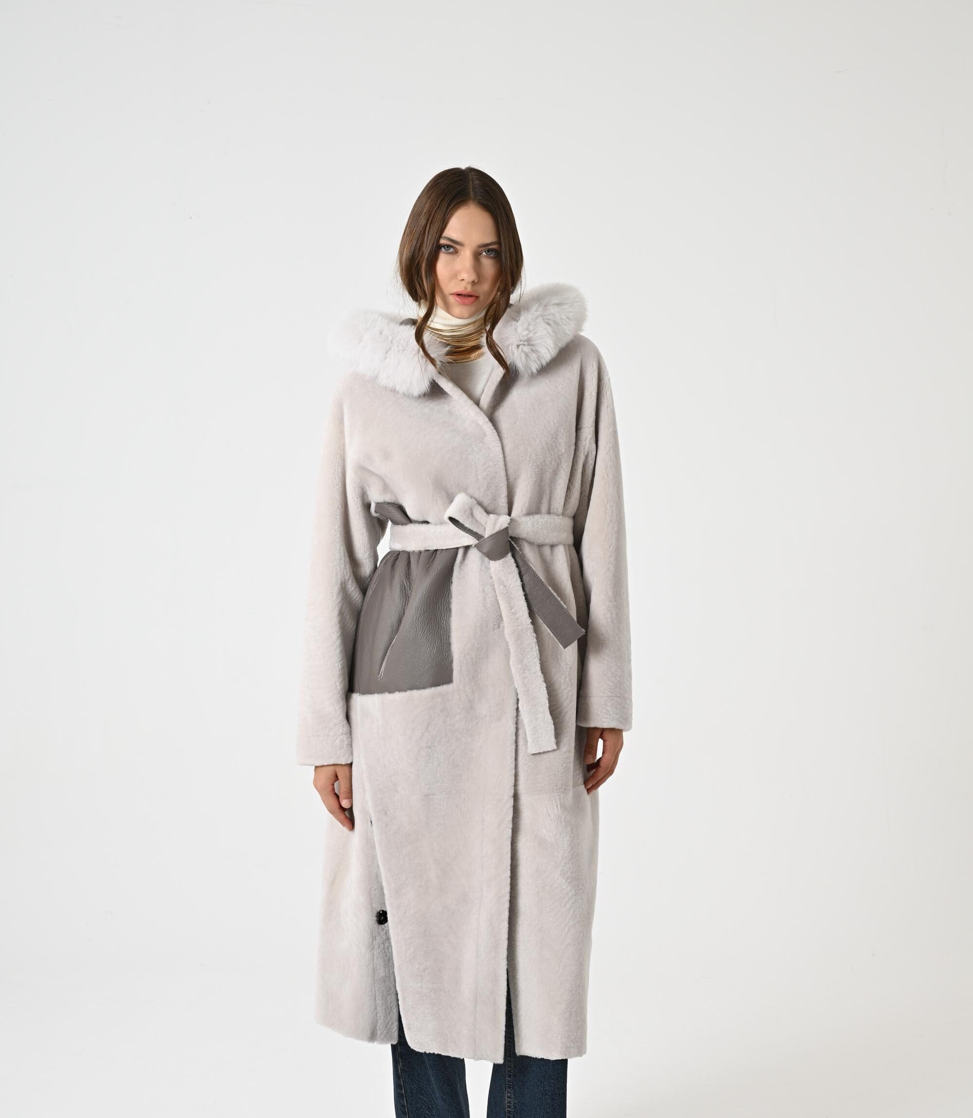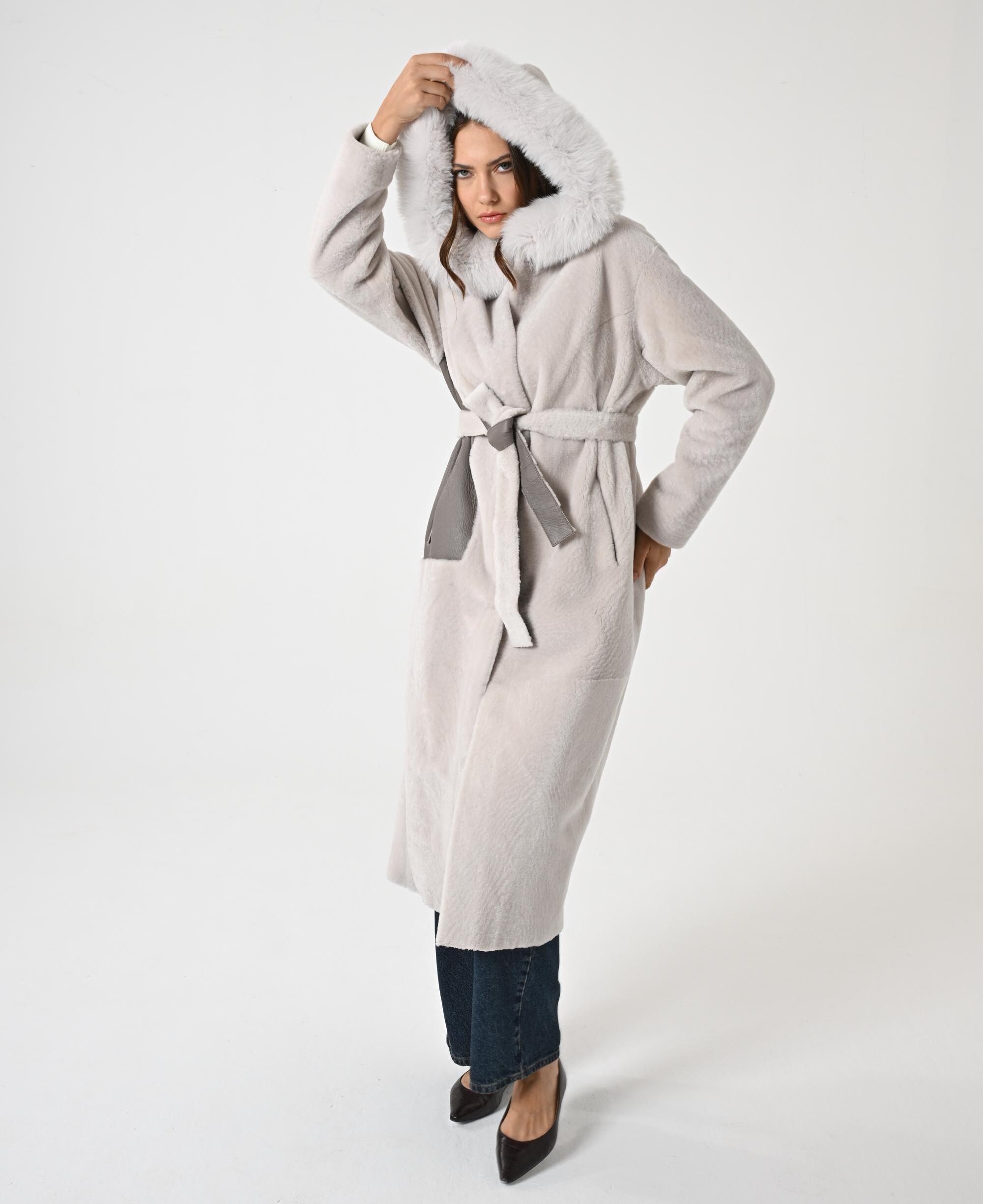 SHEEPSKIN ASTRAKHAN OVERCOAT | Coat for Woman | Beige Genuine Letaher Woman Astrakhan Overcoat | Genuine Fox Trimmed Hooded Overcoat |