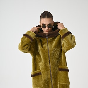 BLACK WOMAN OVERCOAT | Winter Woman Coat | Winter Woman Topcoat | Genuine Spanish Merino Topcoat | Curly Merino Trimmed Hooded Overcoat |
