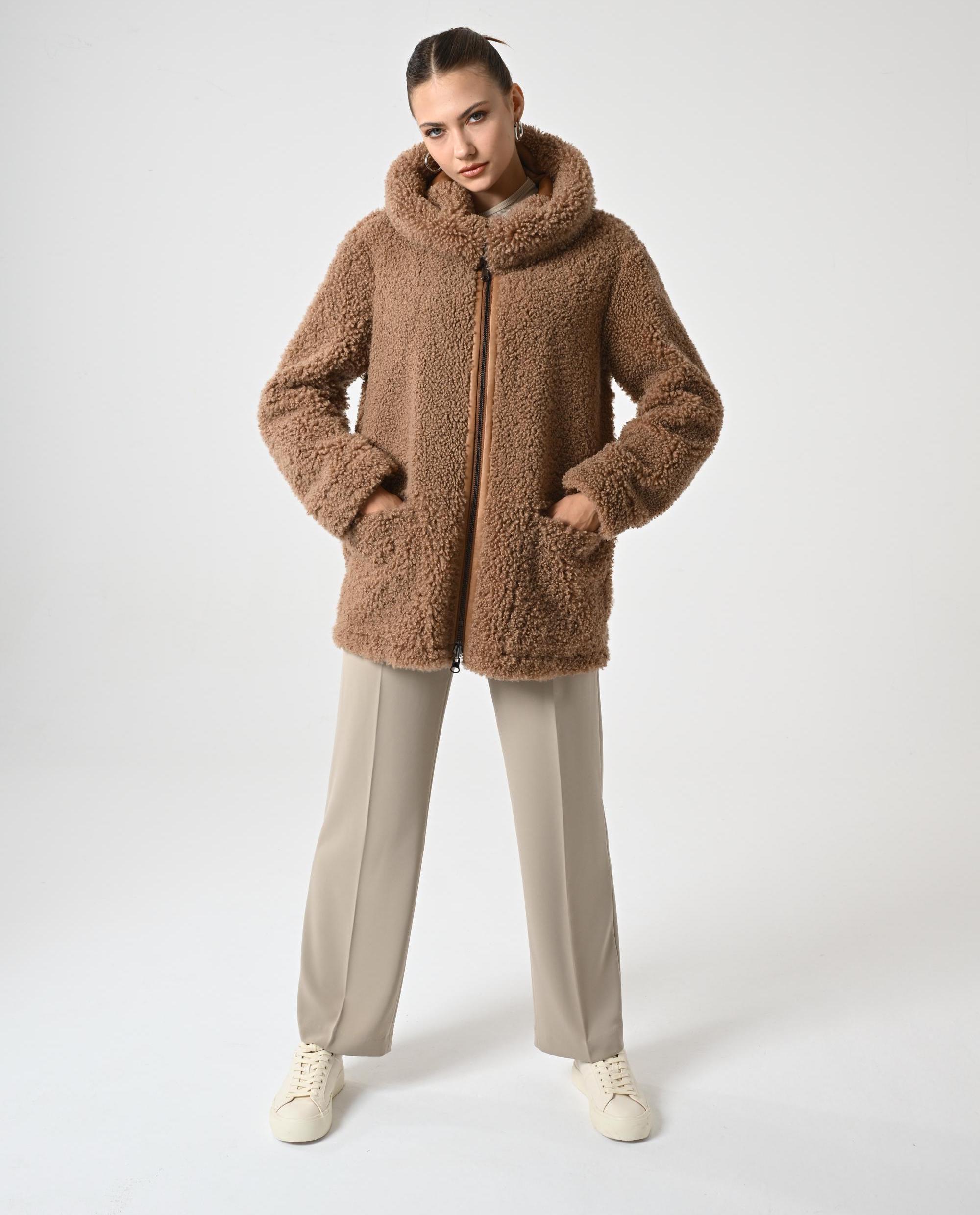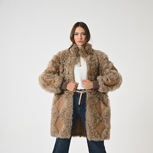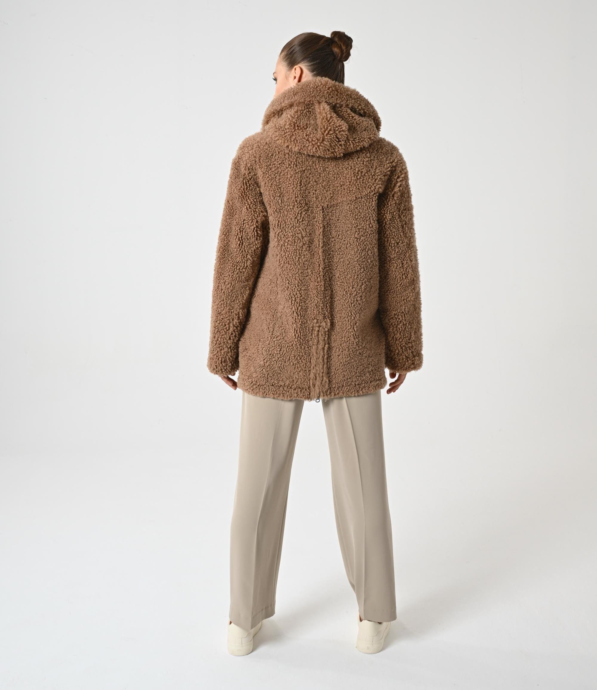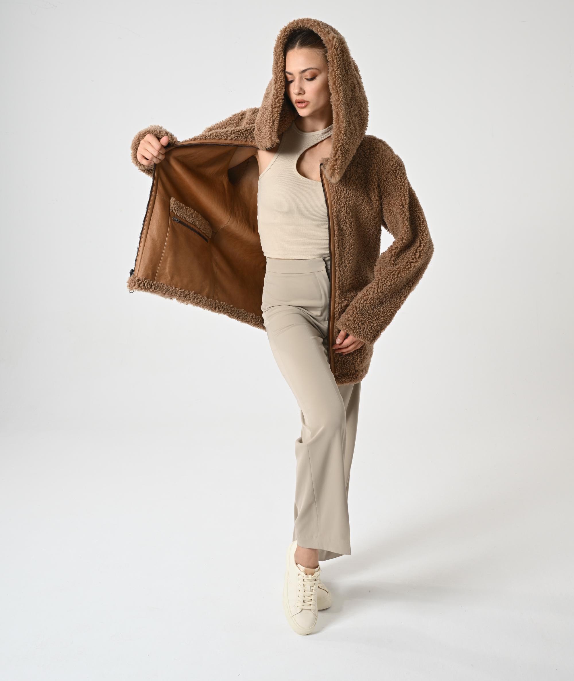 REVERSIBLE COAT | Women Double-Breasted Coat | Woman Pea Coat | Woman Cognac Brown Coat | Woman Duster Coat | Fuzzy Curly Hooded Coat |