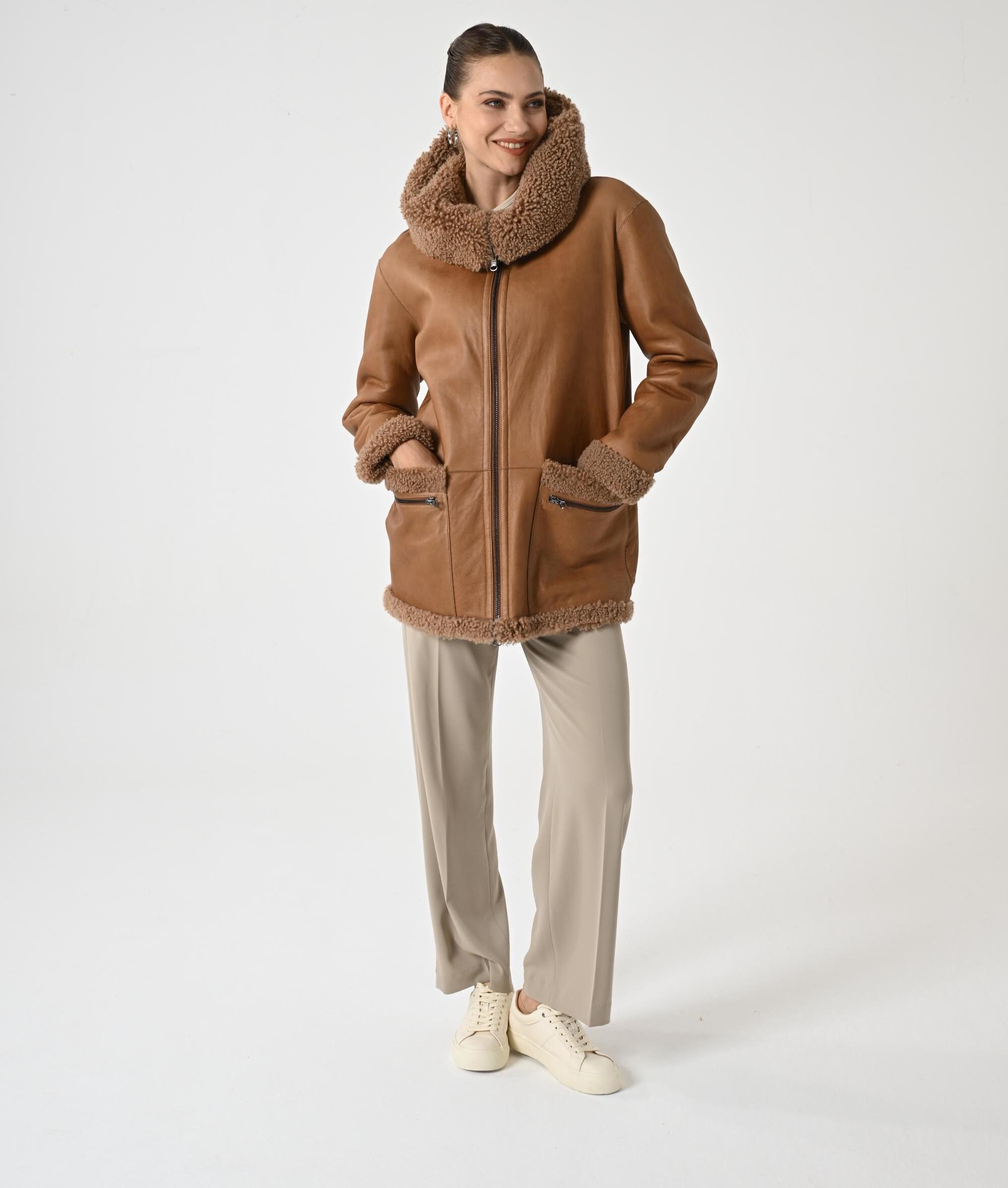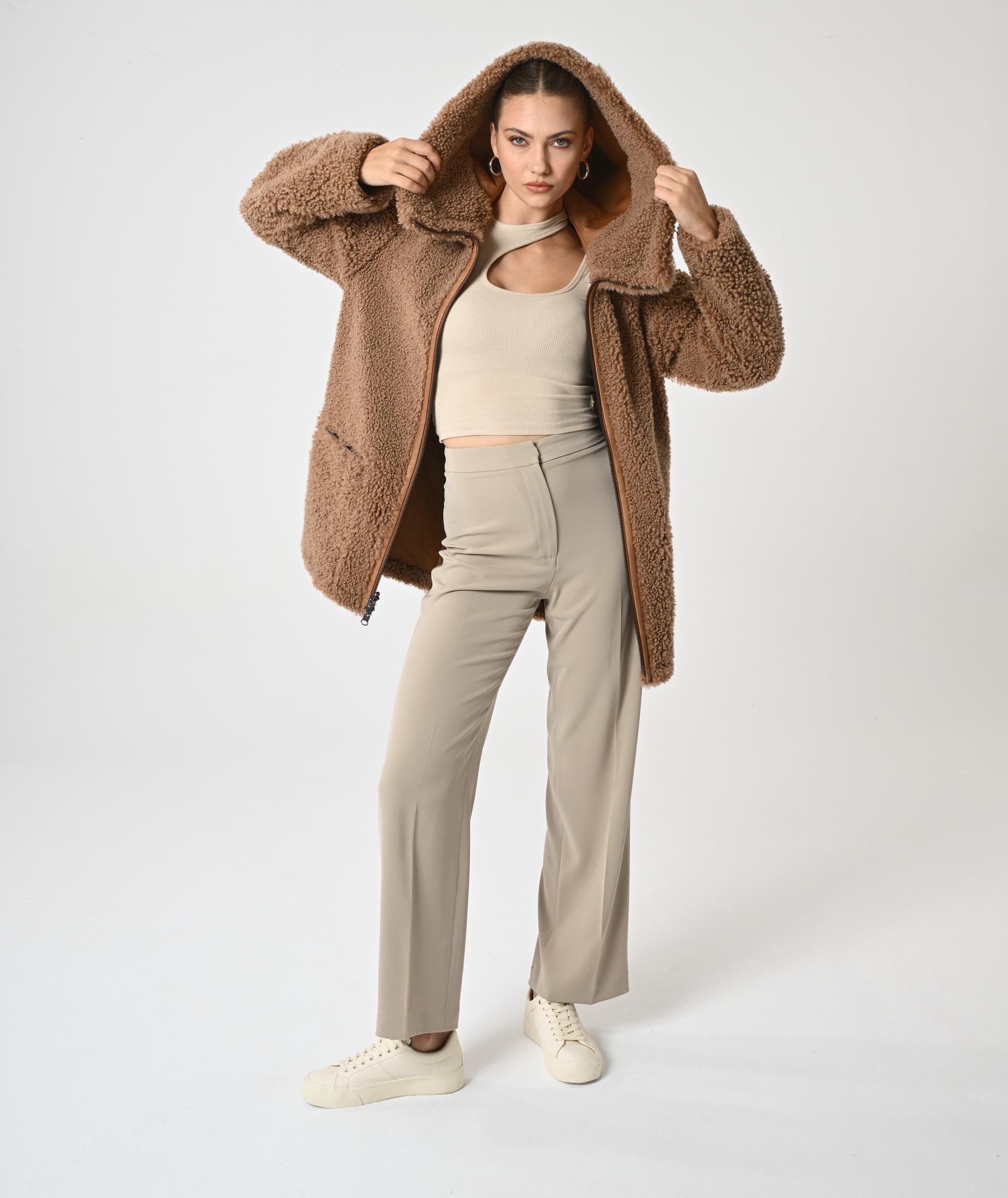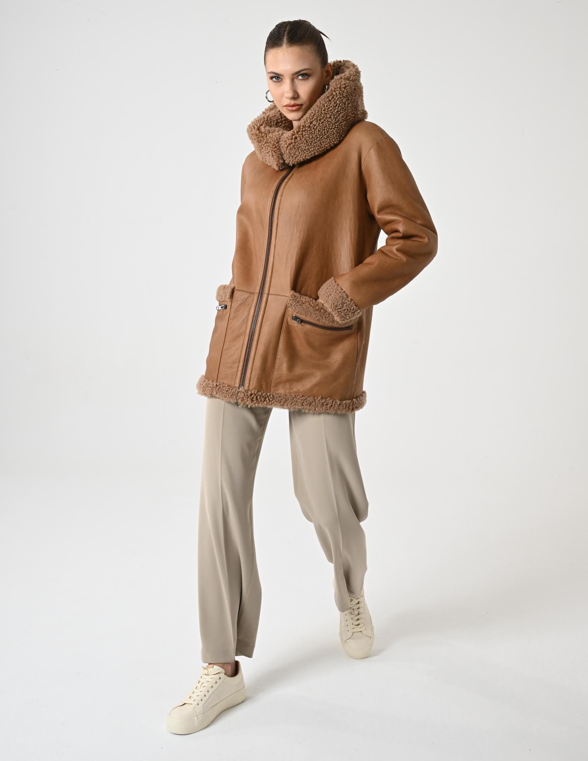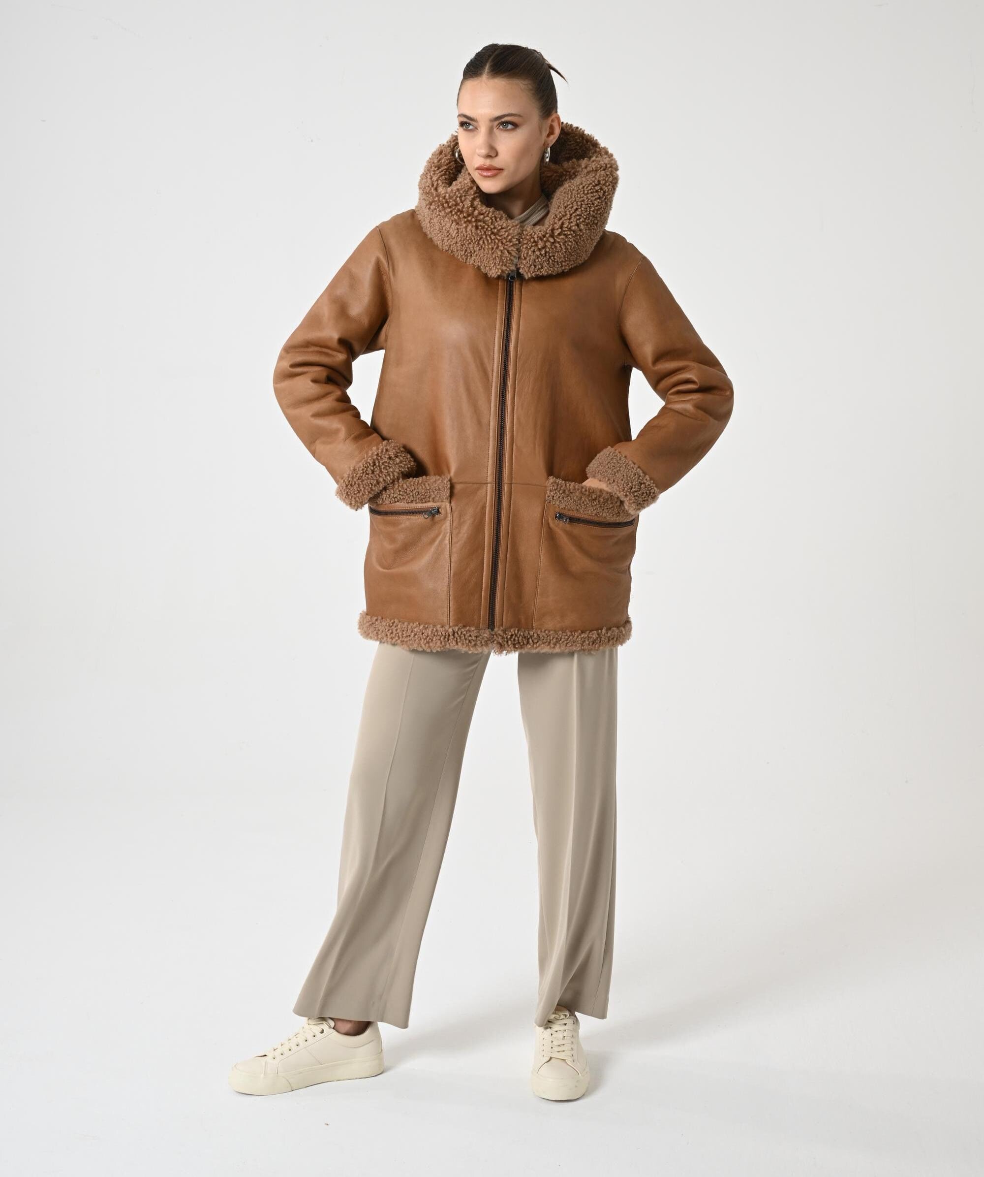 REVERSIBLE COAT | Women Double-Breasted Coat | Woman Pea Coat | Woman Cognac Brown Coat | Woman Duster Coat | Fuzzy Curly Hooded Coat |